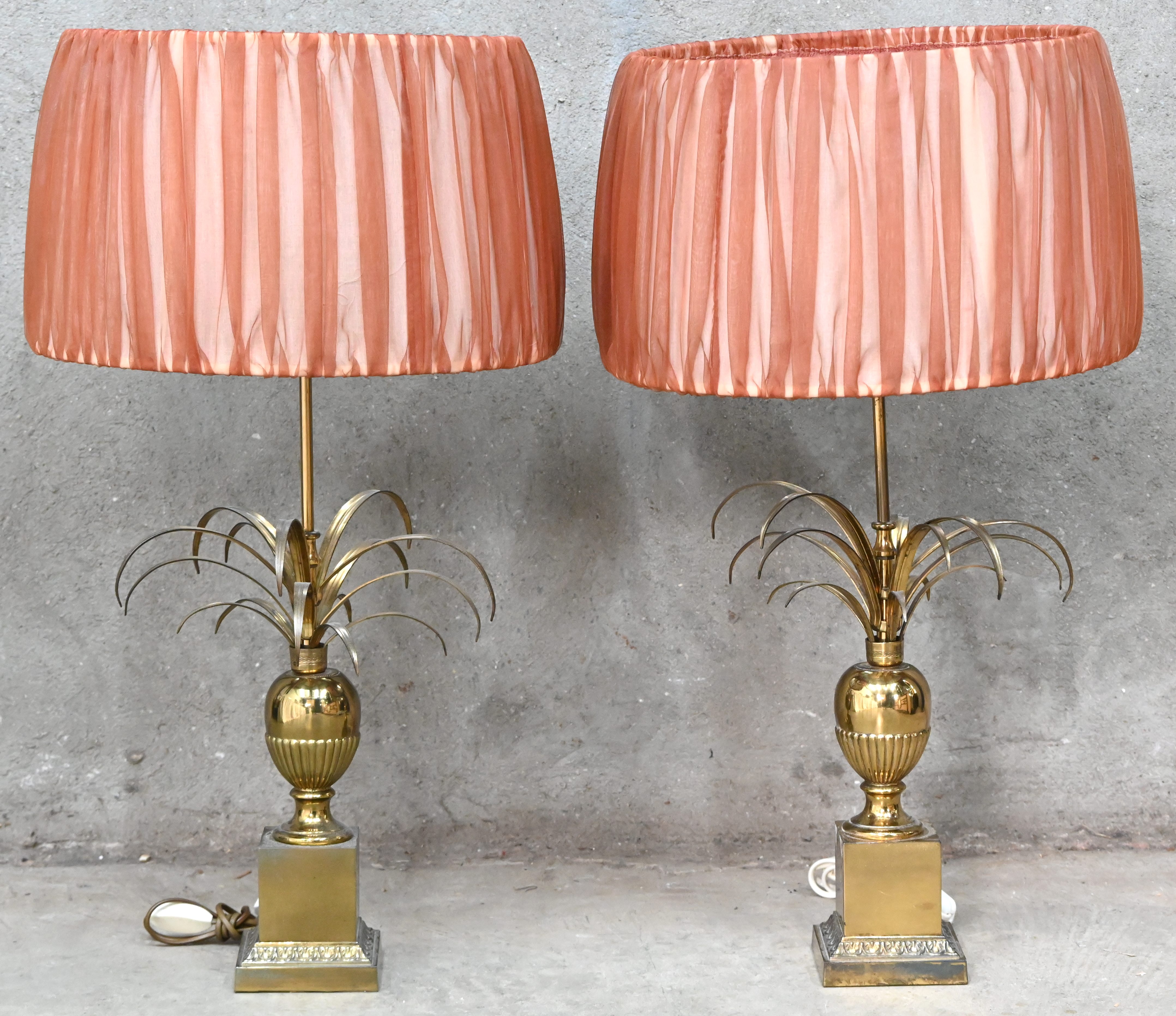 Een set van 2 vintage tafellampen, messing voet in ananasvorm, Hollywood Regency, in de stijl van Maison Charles/Janssen.