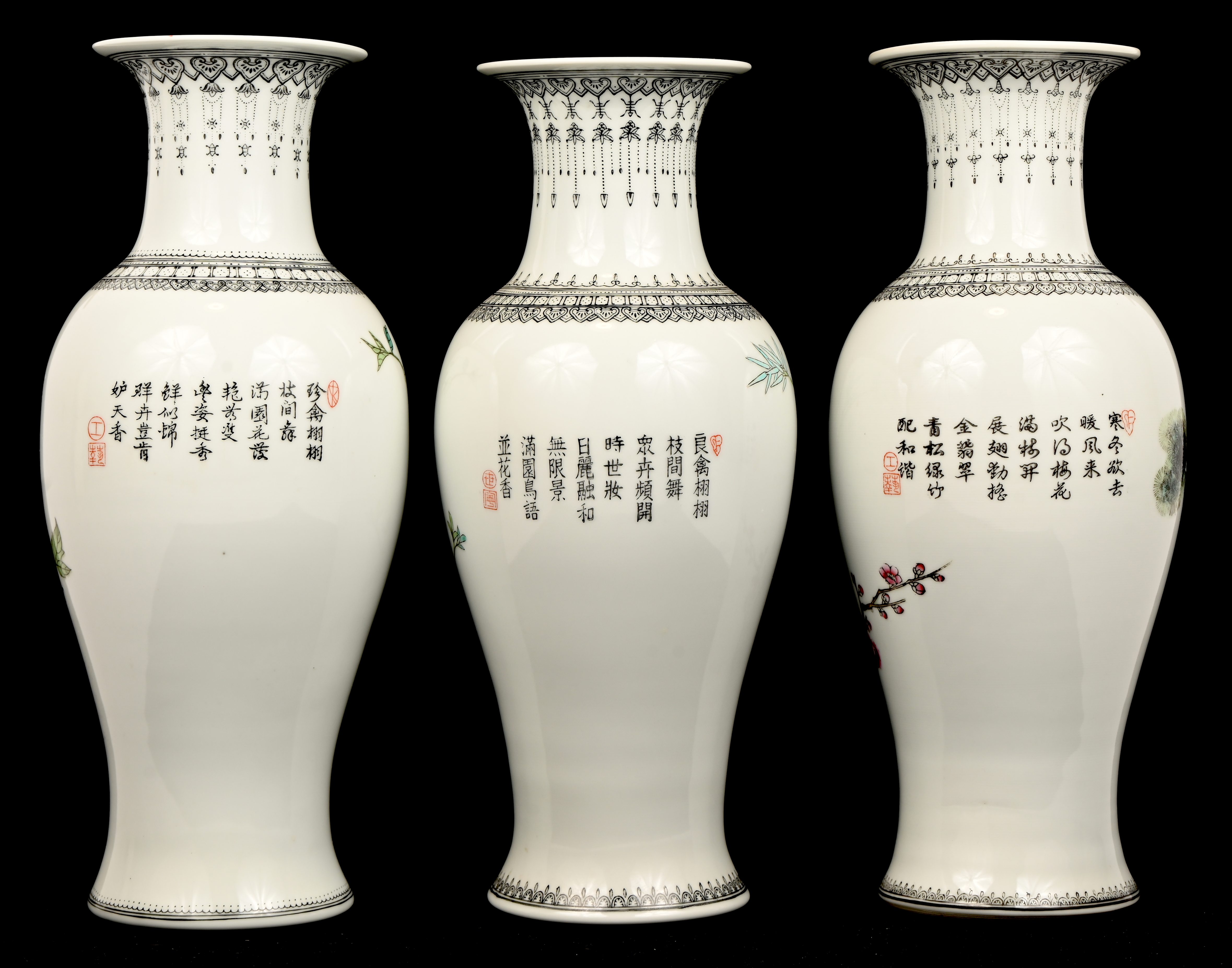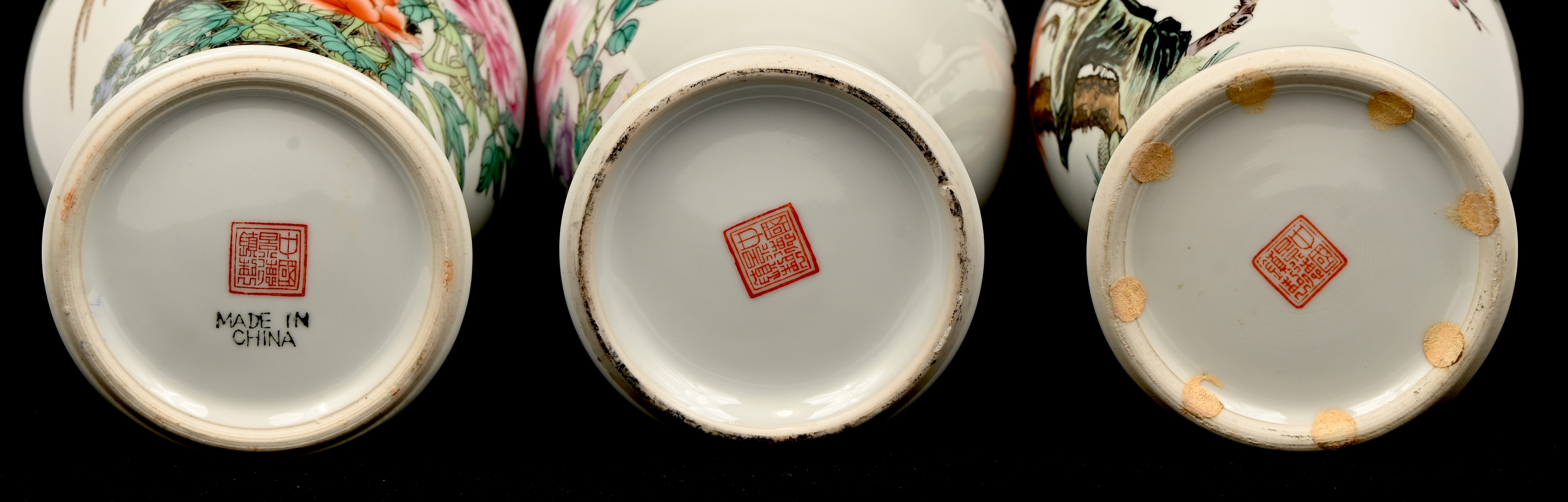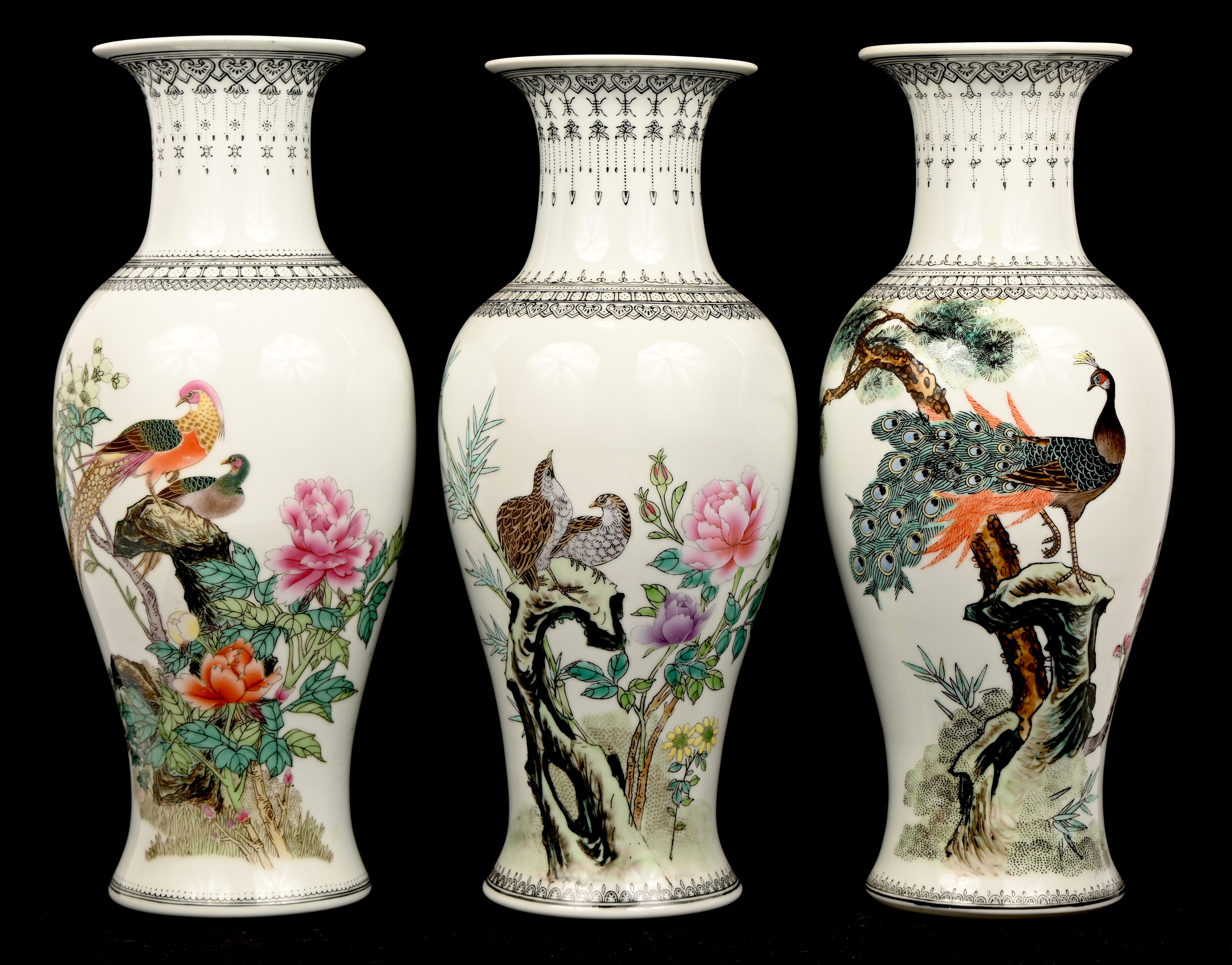 Een set van 3 Chinees porseleinen vazen, famille rose, met vogels in het decor.