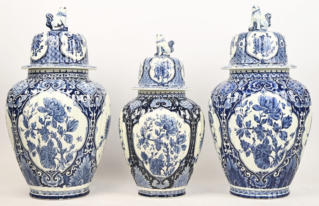 #433Een paar grote dekselvazen van blauw-wit geglazuurd Chinees aardewerk. Met een decor van draken.