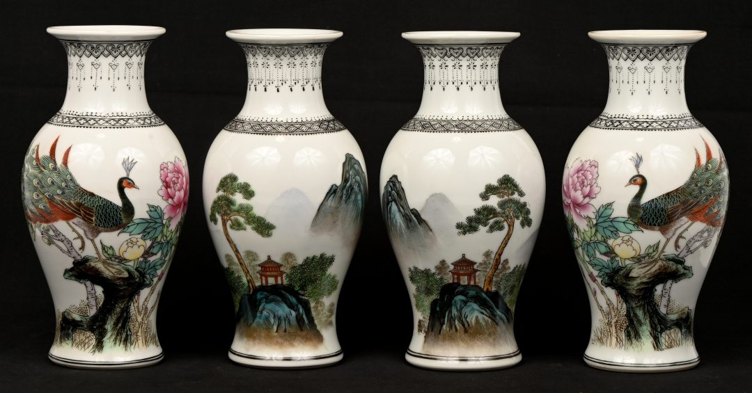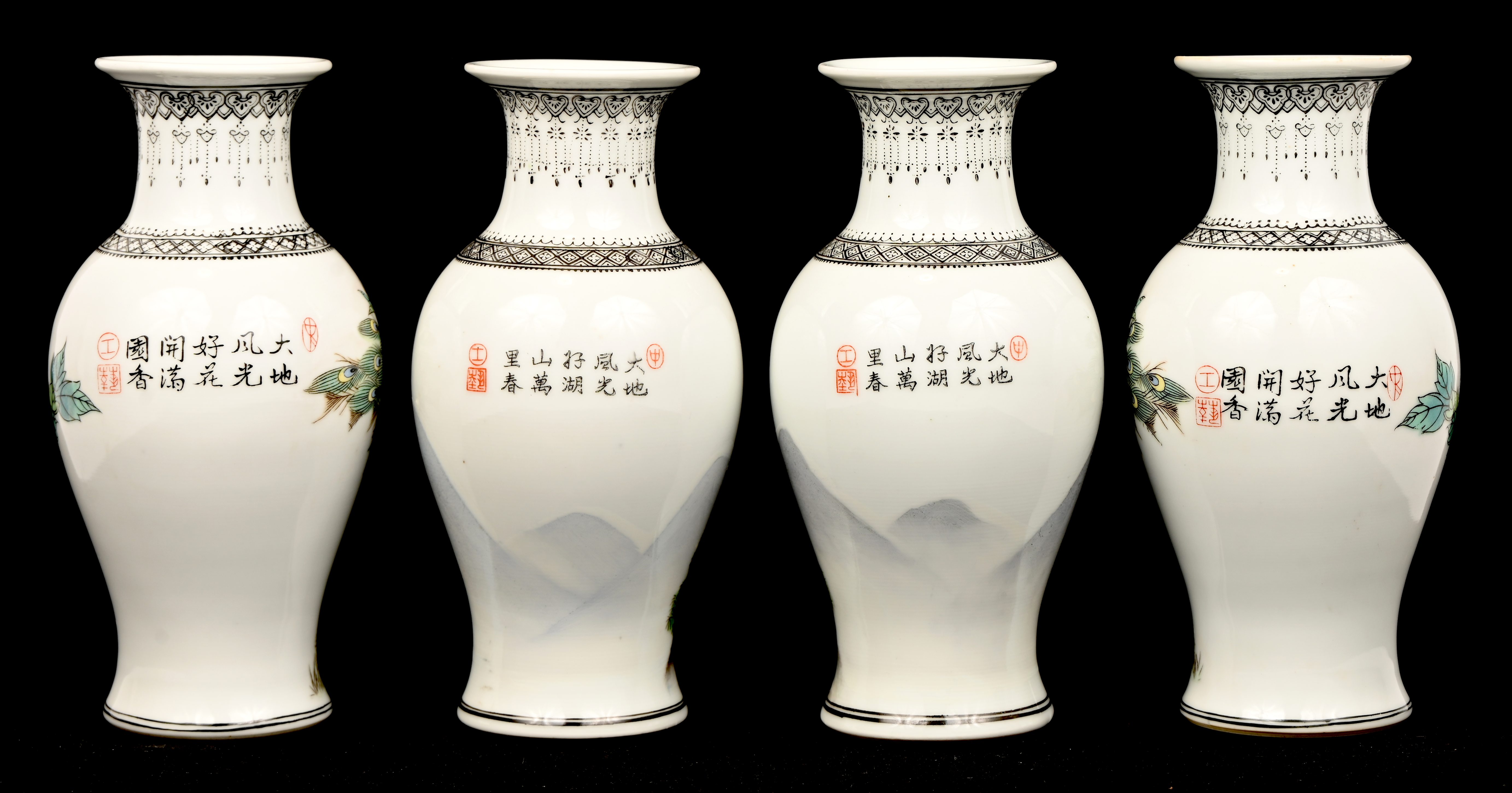 Een set van 4 Chinees porseleinen vazen, famille rose, met landschappen en vogels in het decor.