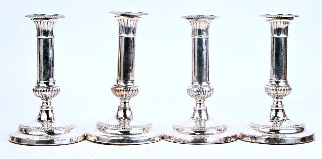 A set of 4 George III candlesticks with detachable bobeches, marked John Roberts & Co, Sheffield (1805-1814) with assay marks P, 1807, and S, 1808. Weighted base. Estimate: $70.
