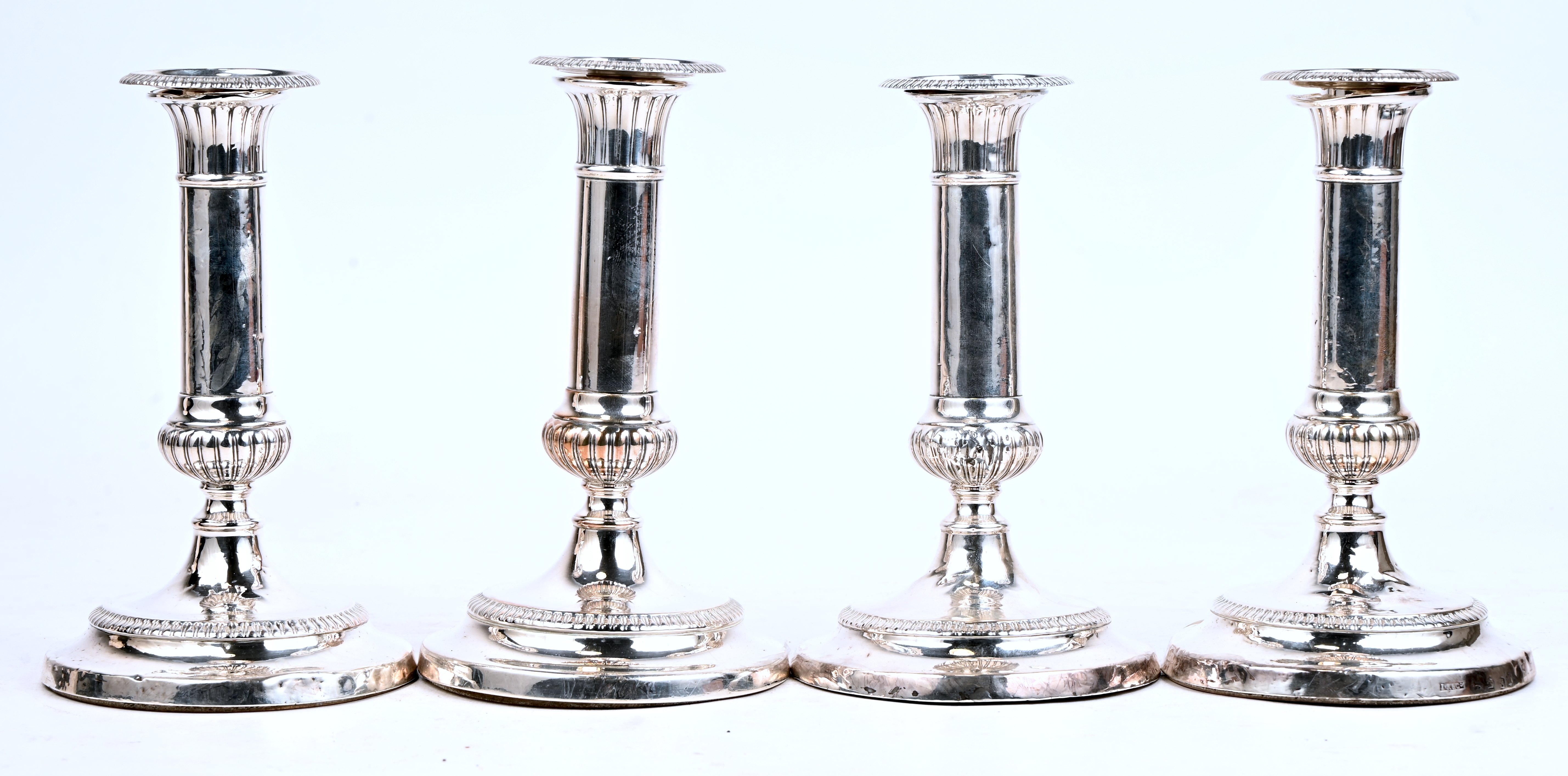 Een set van 4 George III kandelaars met losse bobeches, gemerkt John Roberts & Co, Sheffield (1805-1814) met jaarletters P, 1807, en S, 1808. Verzwaarde voet. S70