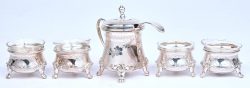 Een lot van 5 peper- en zoutpotjes met (meestal beschadigde) glazen inzetpotjes, het grootste met lepeltje. Duitse keuren, 800/1000. 160 gram. AR14/2 AR14/3 AR14/4
