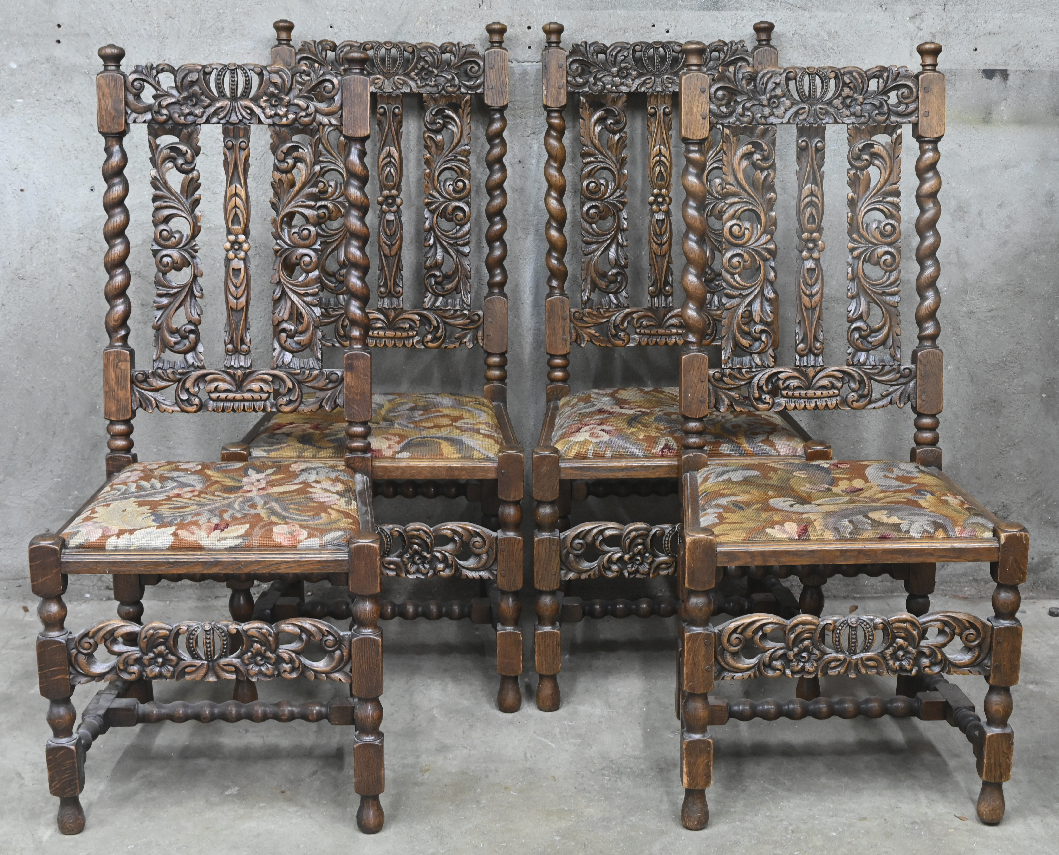 Een set van 4 gesculpteerde eikenhouten stoelen met florale gobelin zitting.