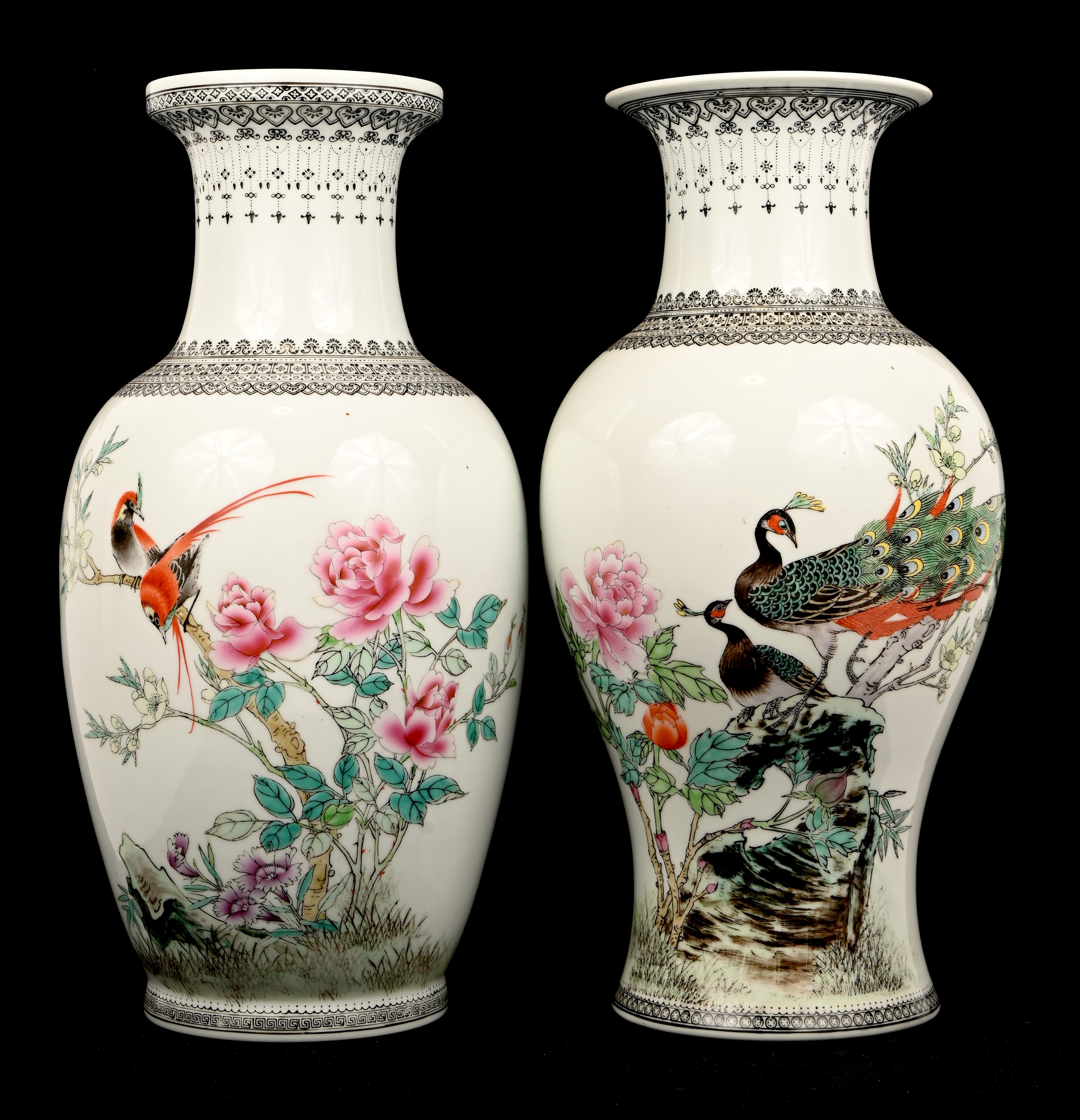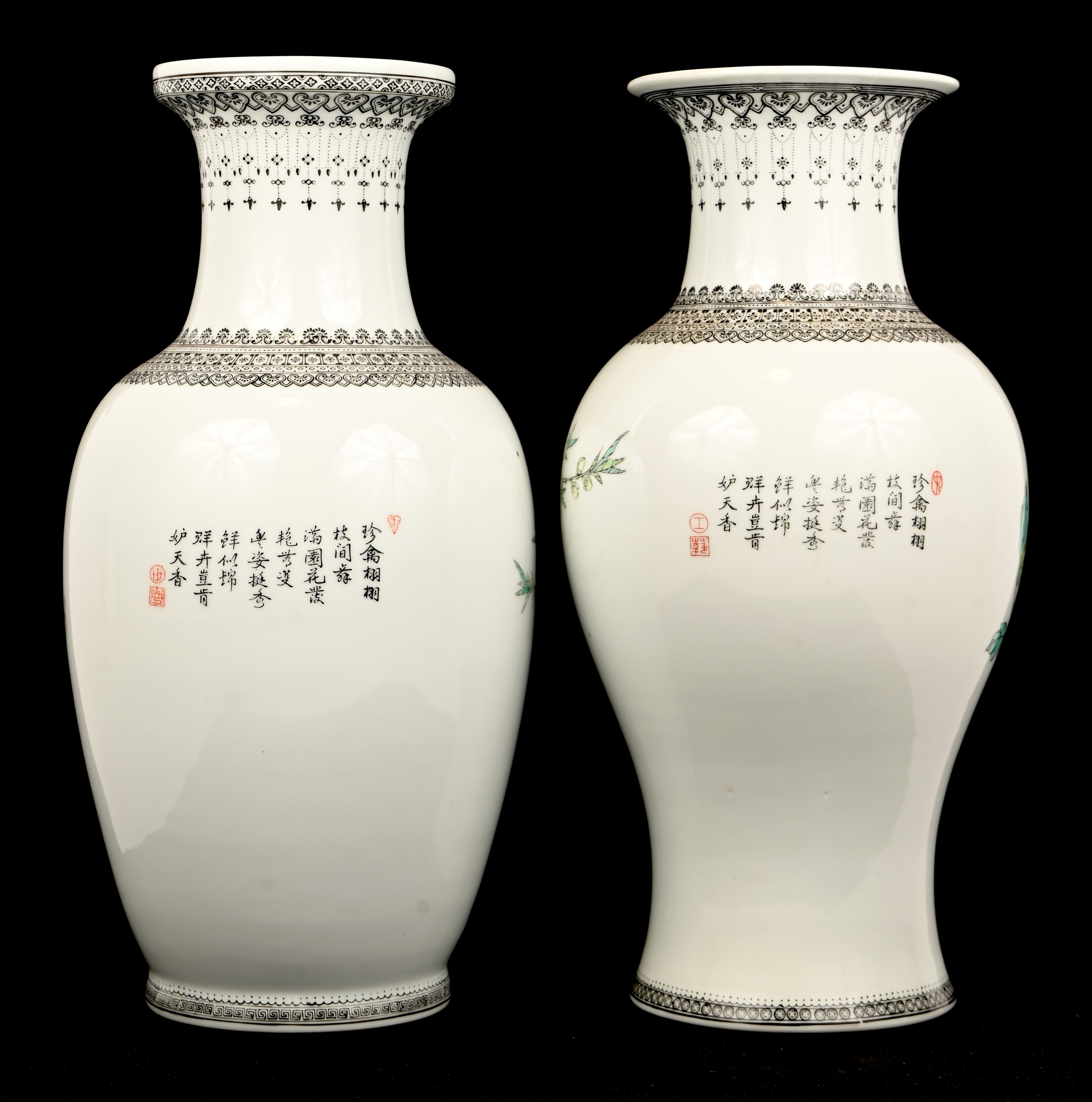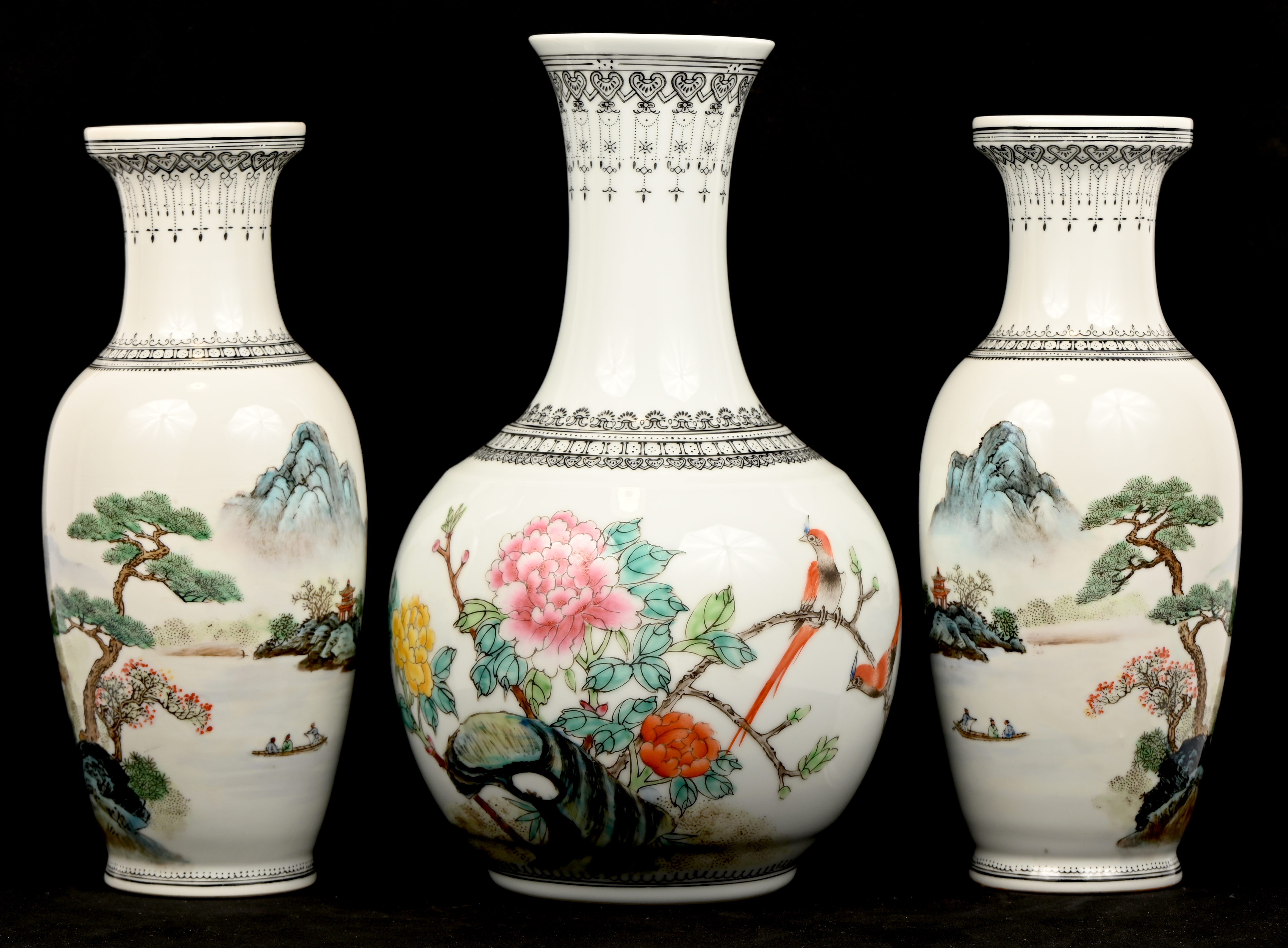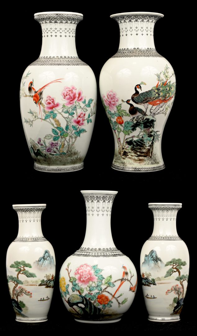 Een set van 5 Chinees porseleinen vazen van verschillende vormgeving, famille rose, met vogels en landschappen in het decor.