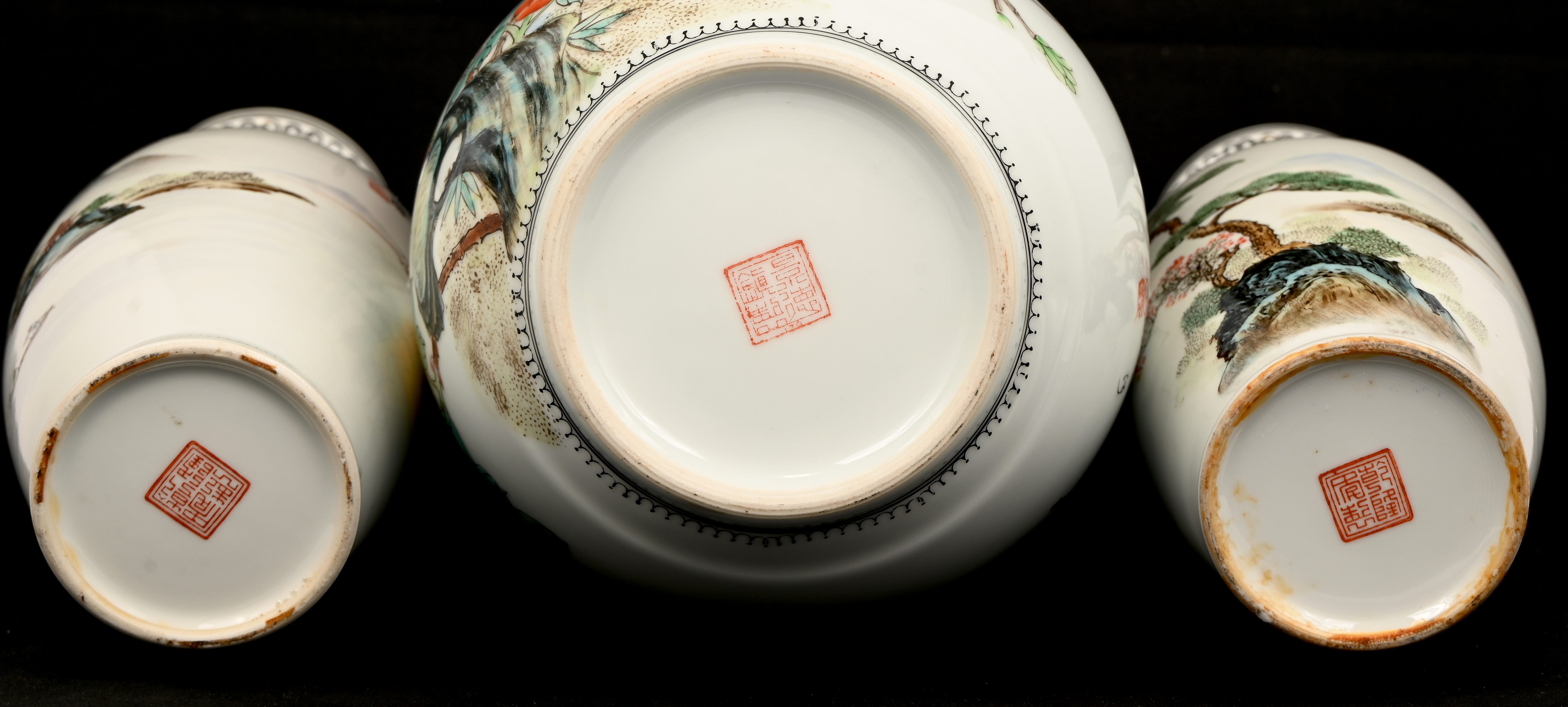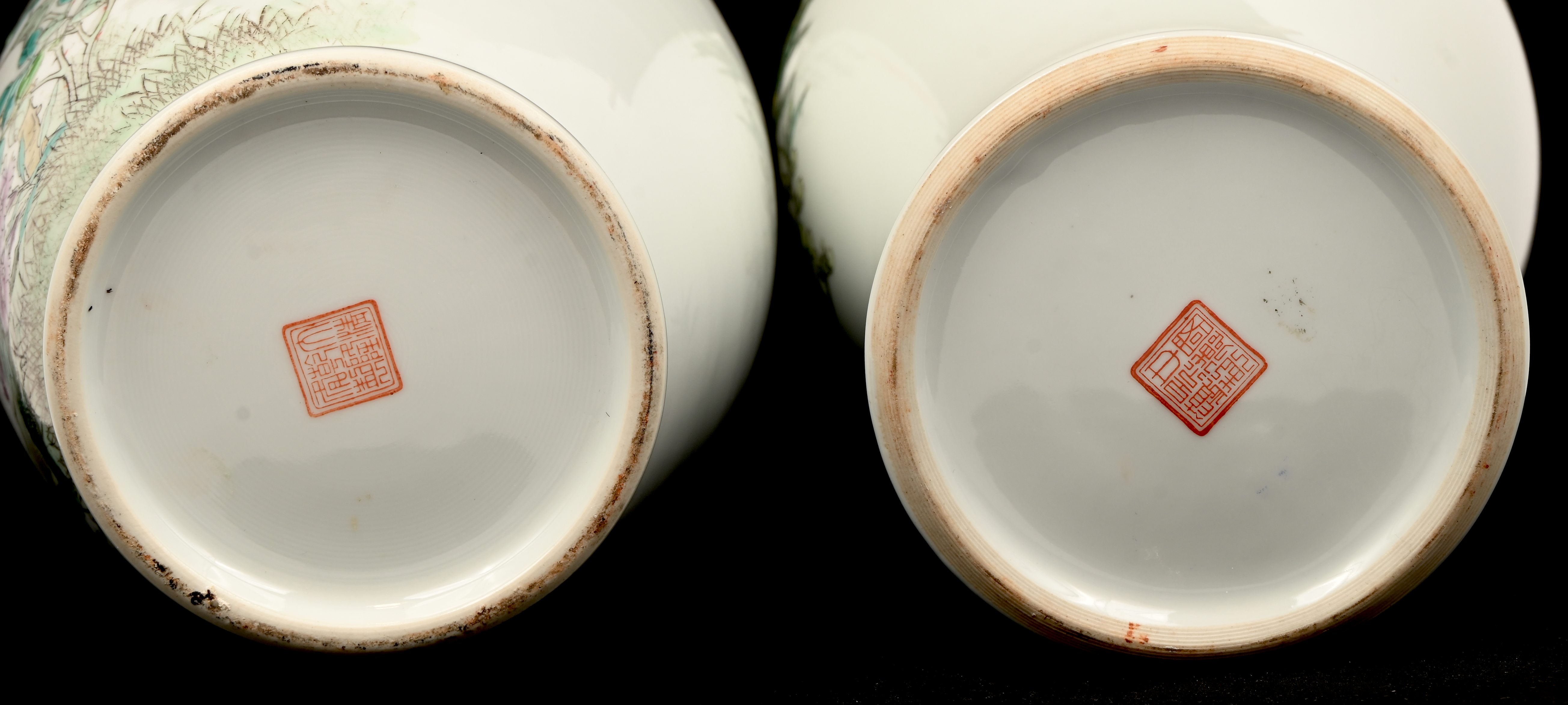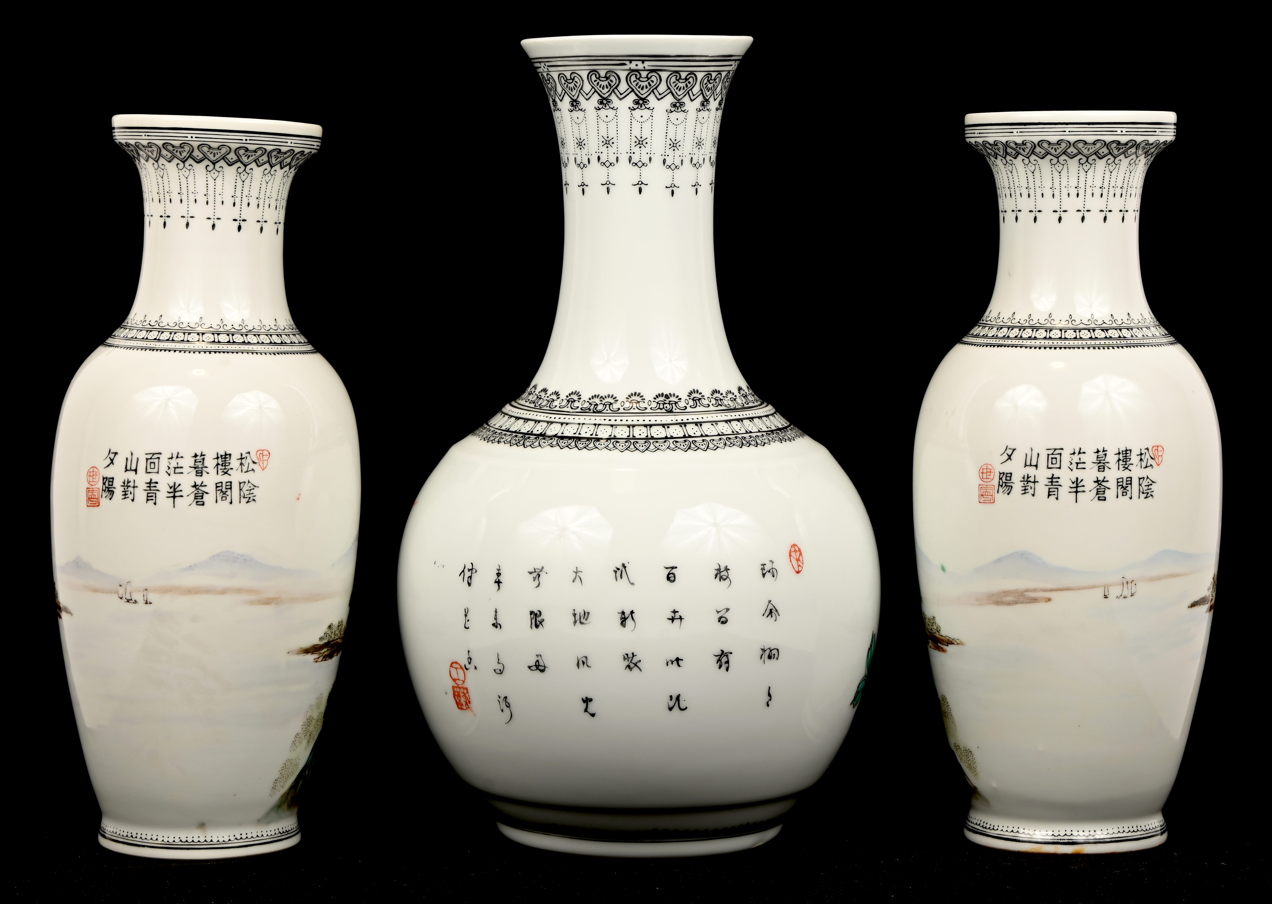 Een set van 5 Chinees porseleinen vazen van verschillende vormgeving, famille rose, met vogels en landschappen in het decor.