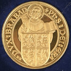 "Completion of the restoration of the Leuven town hall, 1982." 250 Lovenaar. Medal of yellow gold 900/1000, 5.50 g. Ed. Europe Mint.Place a bid ›Estimate: € 400 / 550 -
