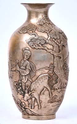 #317Een verzilverd Chinees vaasje met een decor in hoogreliëf, onderaan gemerkt.