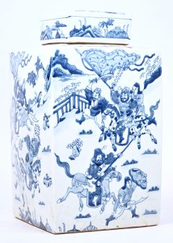 A square Chinese porcelain storage jar with warriors in the decoration. -