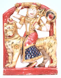 ‘Durge on the tiger’, an Indian statue made of painted alabaster. Durga symbolizes divine feminine power (Shakti), mother of the universe, warrior against evil, and embodiment of courage and determination. -