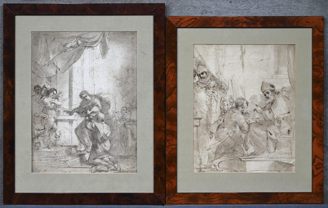 A varied lot of frames, consisting of an etching, an engraving, and a drawing. -