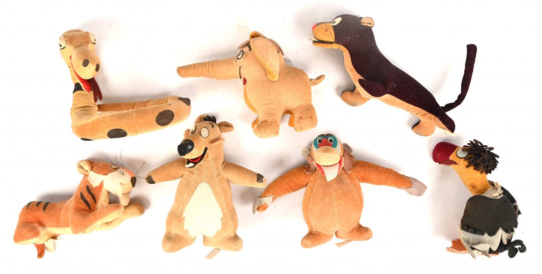 Een set van zeven vintage popjes, naar personages uit het verhaal ‘Jungle book’ door Rudyard Kipling. Geproduceerd door Walt Disney, made in Japan.