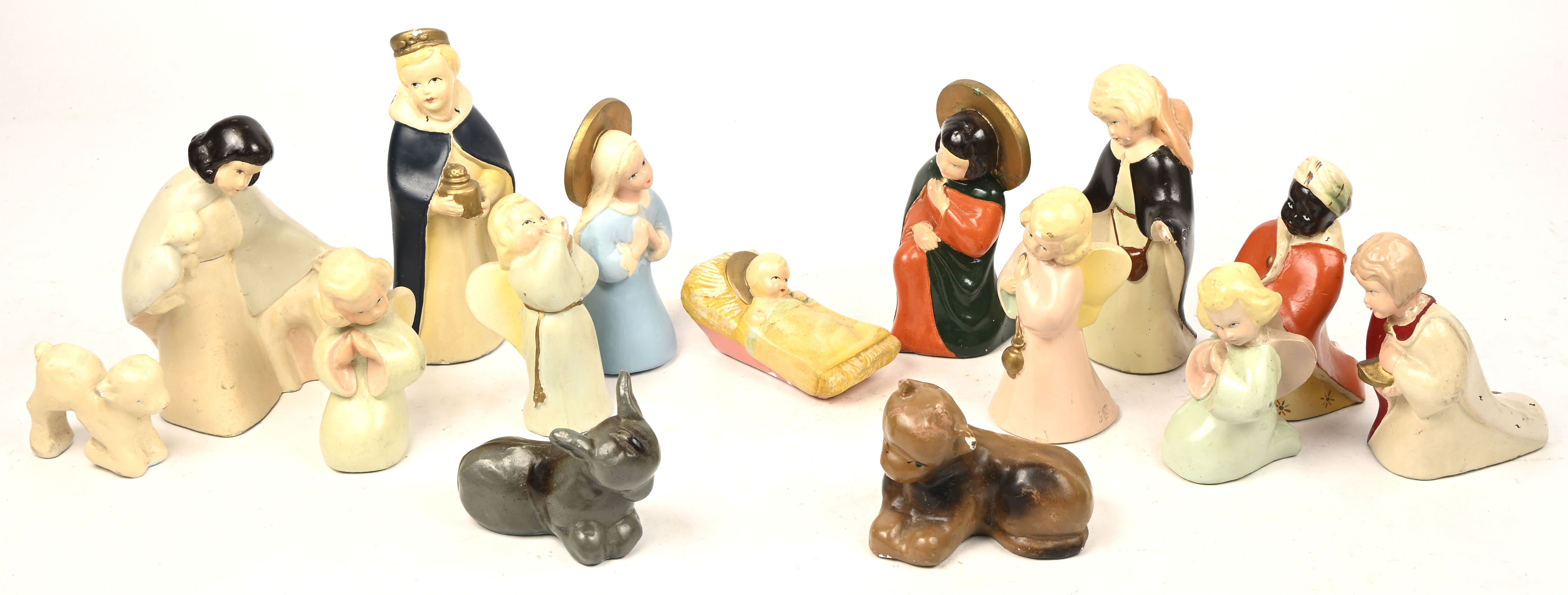 #73Een lot van twee 19e eeuwse beeldjes, meerkleurig porselein, in de stijl van Meissen, niet gemerkt. Toegevoegd een engeltje en een cornetvaasje.