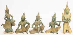 #583Een lot van 4 deels vergulde bronskleurige zamakken muzikanten en een tempelwachter van Zuid-Oost-Aziatische herkomst.