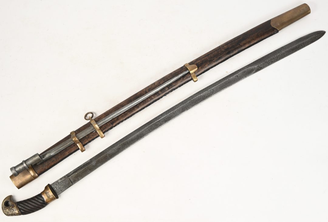 #357Een ‘Dayak’, koppensnellerszwaard in houten schede. Met gesculpteerd benen heft.