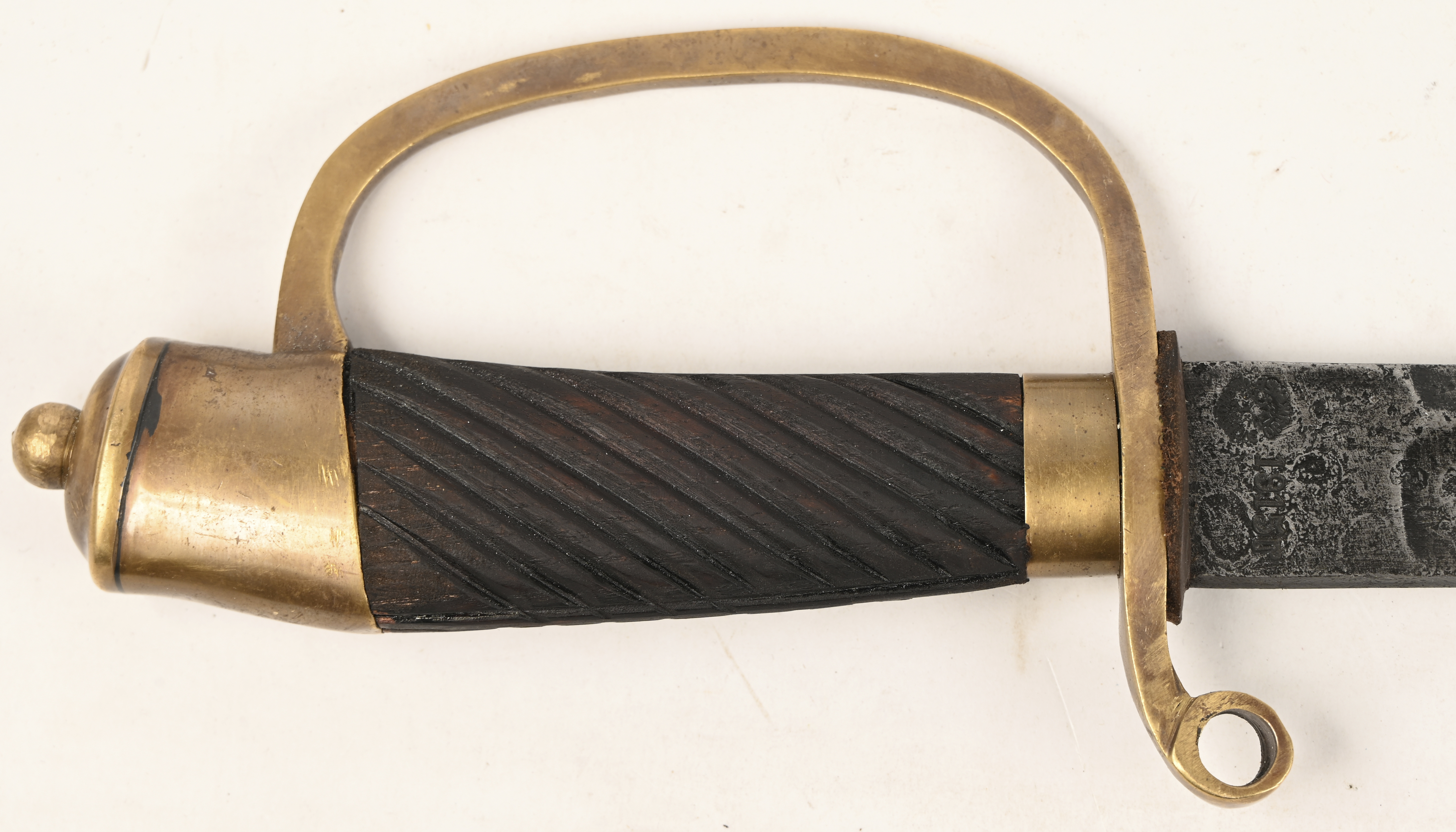 #97Een Shashka replica, Kozakkensabel geproduceerd in de Zlatoust Wapenfabriek. Rusland. Gestempeld op het lemmet met een hamer en sikkel en het jaartal 1934. Op de pommel CCCP en een gevleugelde hamer en sikkel. Aan de schede is een bajonet bevestigd, type Mosin Nagant M91/30.