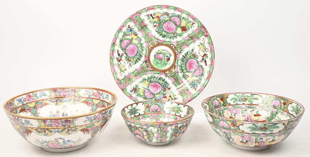 #67Een lot van 6 Chinees porseleinen kommen waarvan één gelijmd, toegevoegd 4 lepels.