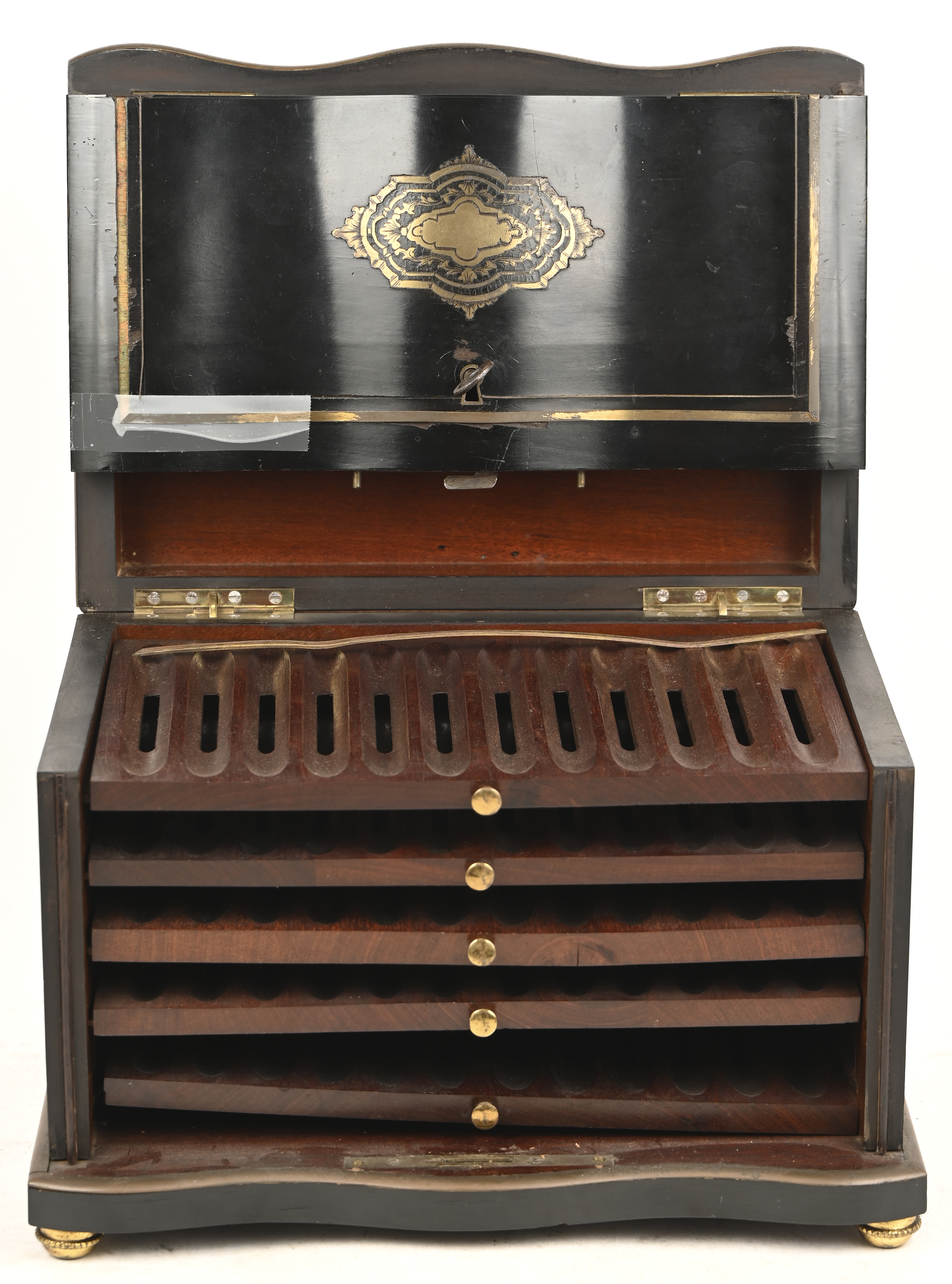 Een sigarenkistje van geëboniseerd hout met messing inleg. Enkele stukjes messing zitten los, één stuk is manco.