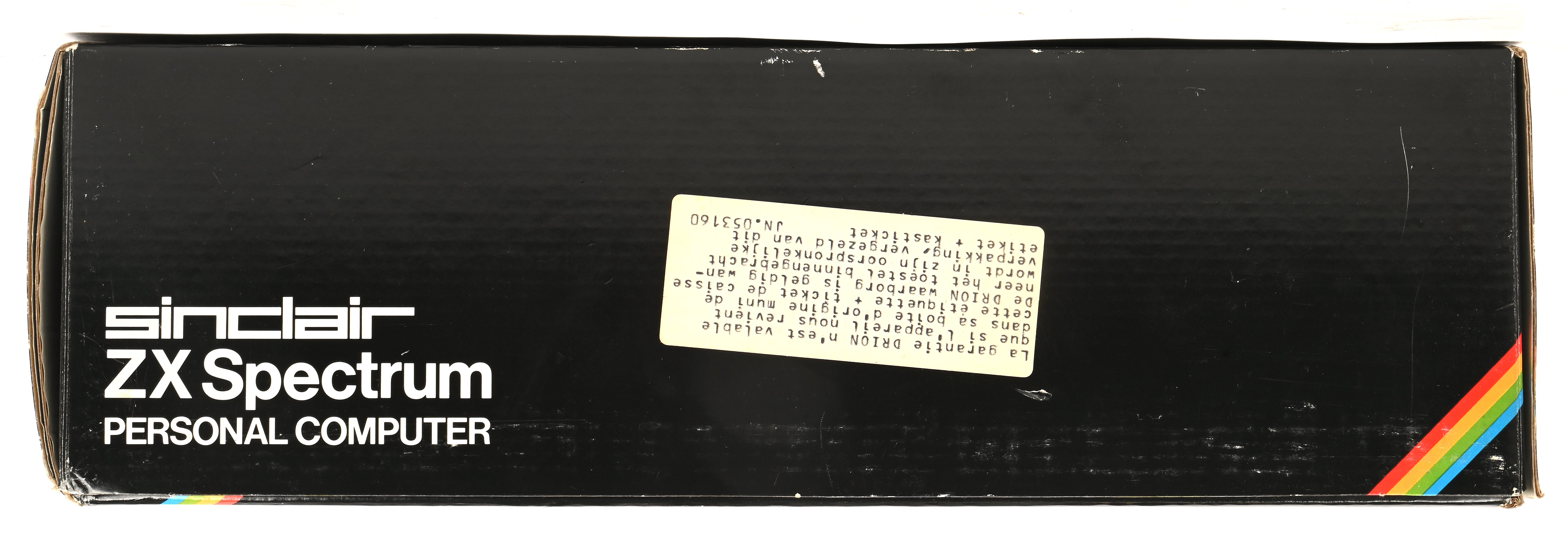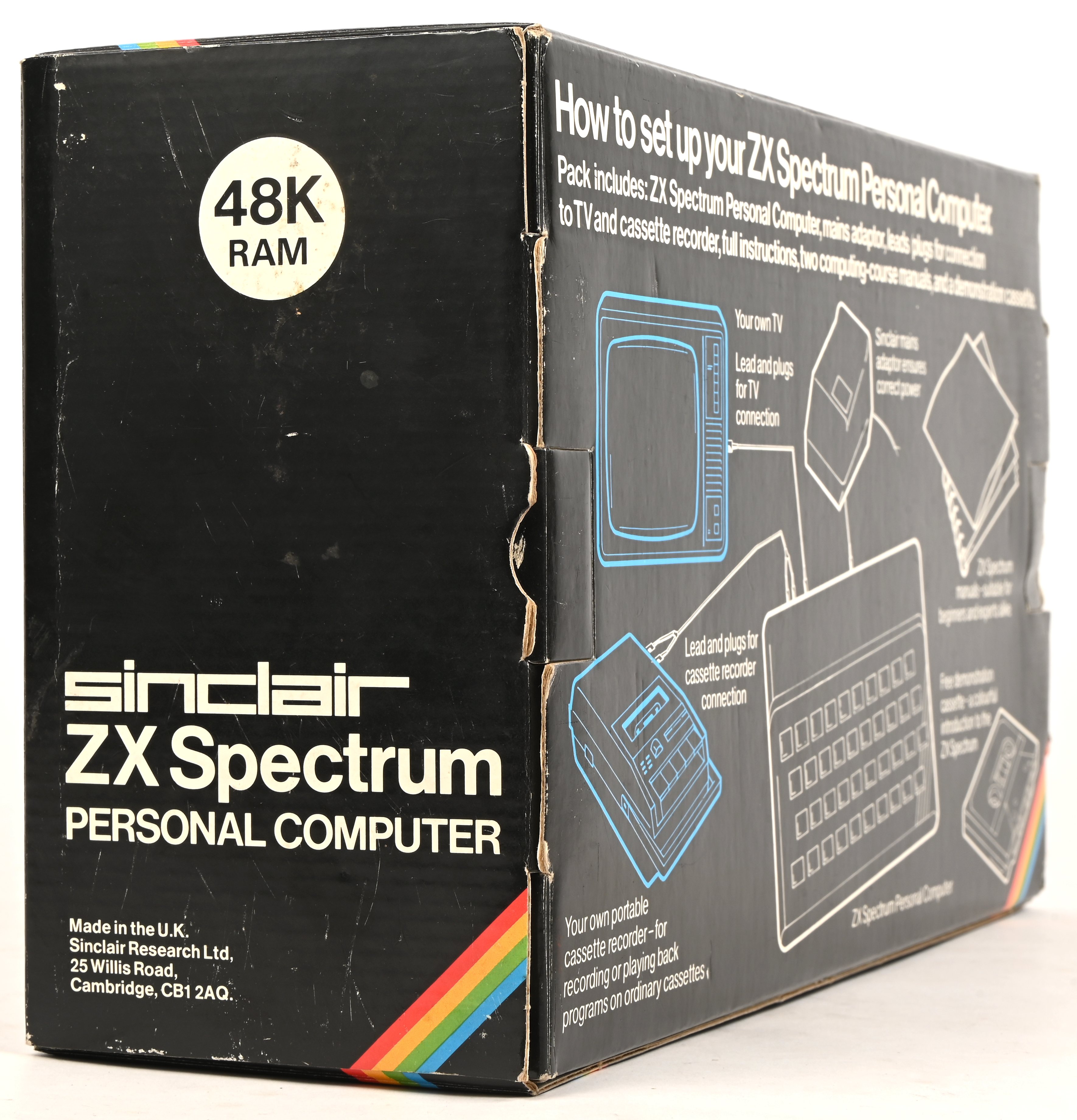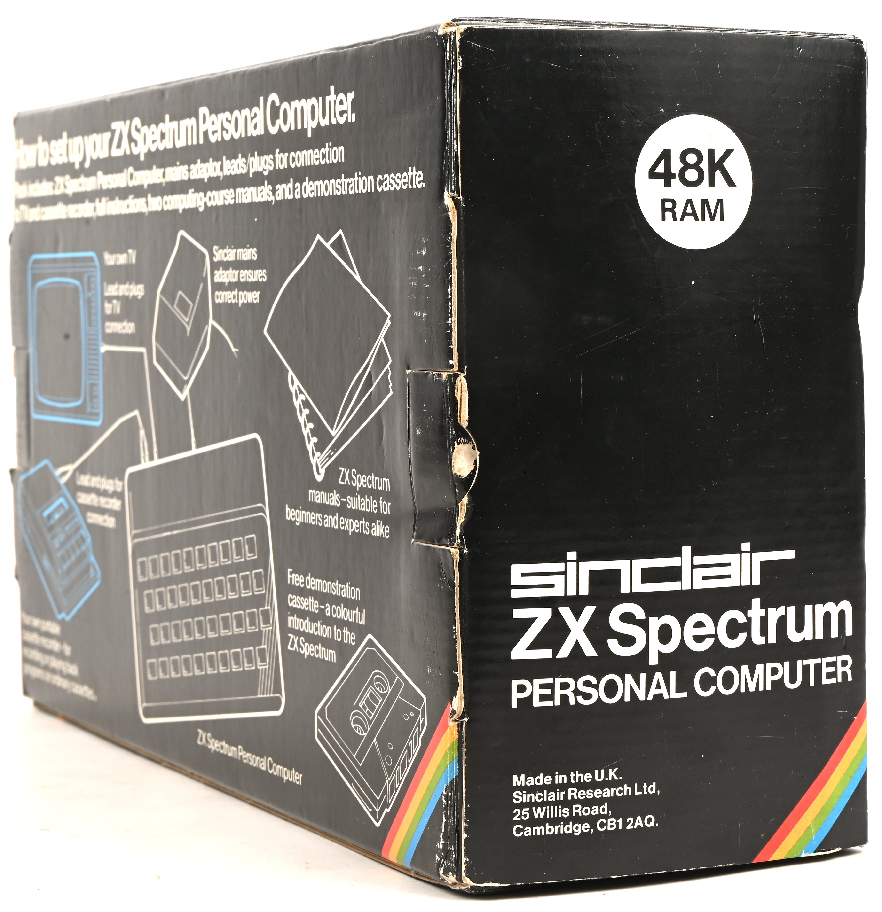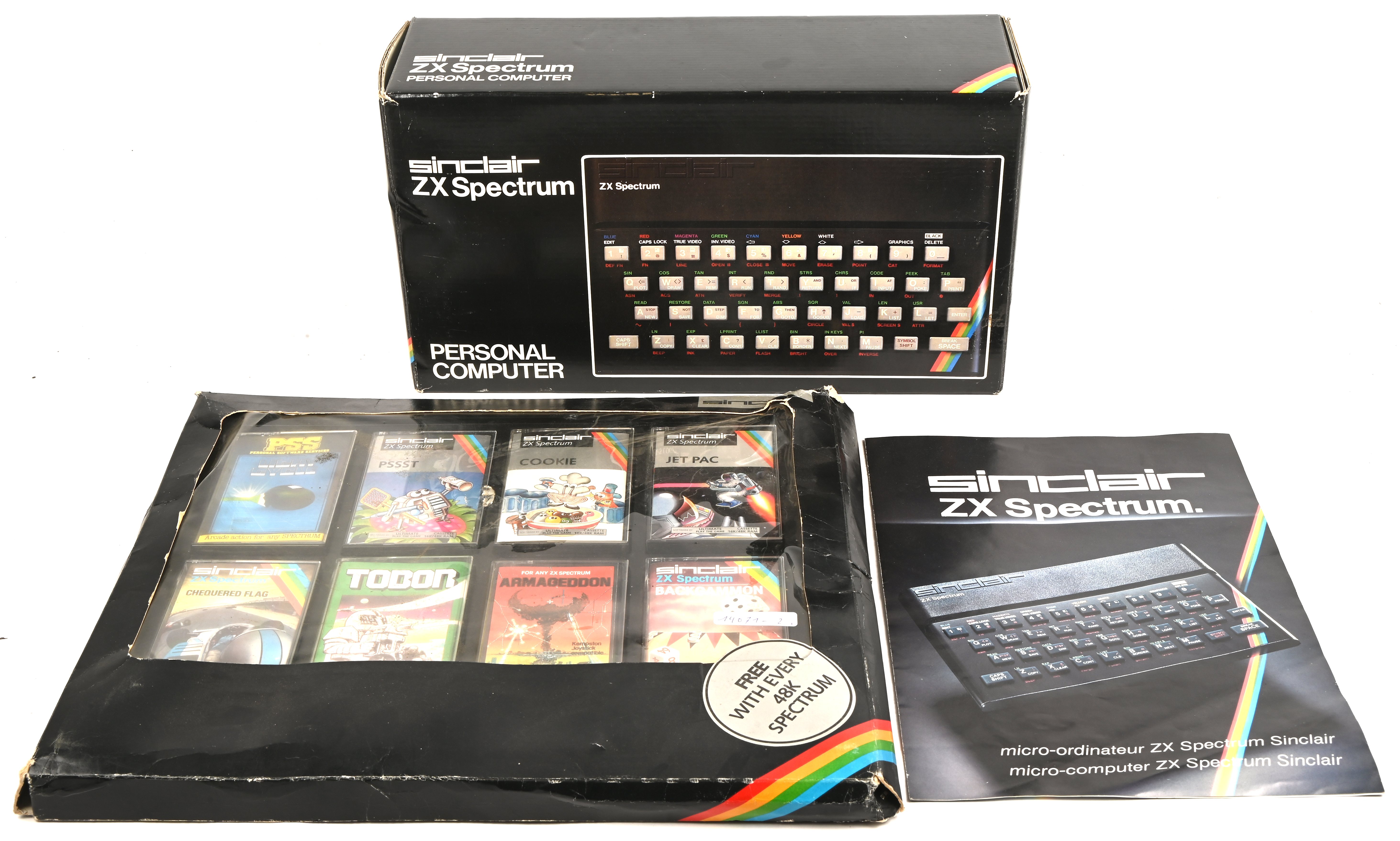 A Sinclair ZX Spectrum personal computer, 48k in original box and packaging, in new condition, with the accompanying set of 8 games on cassette (boxes of cassettes in lesser condition).