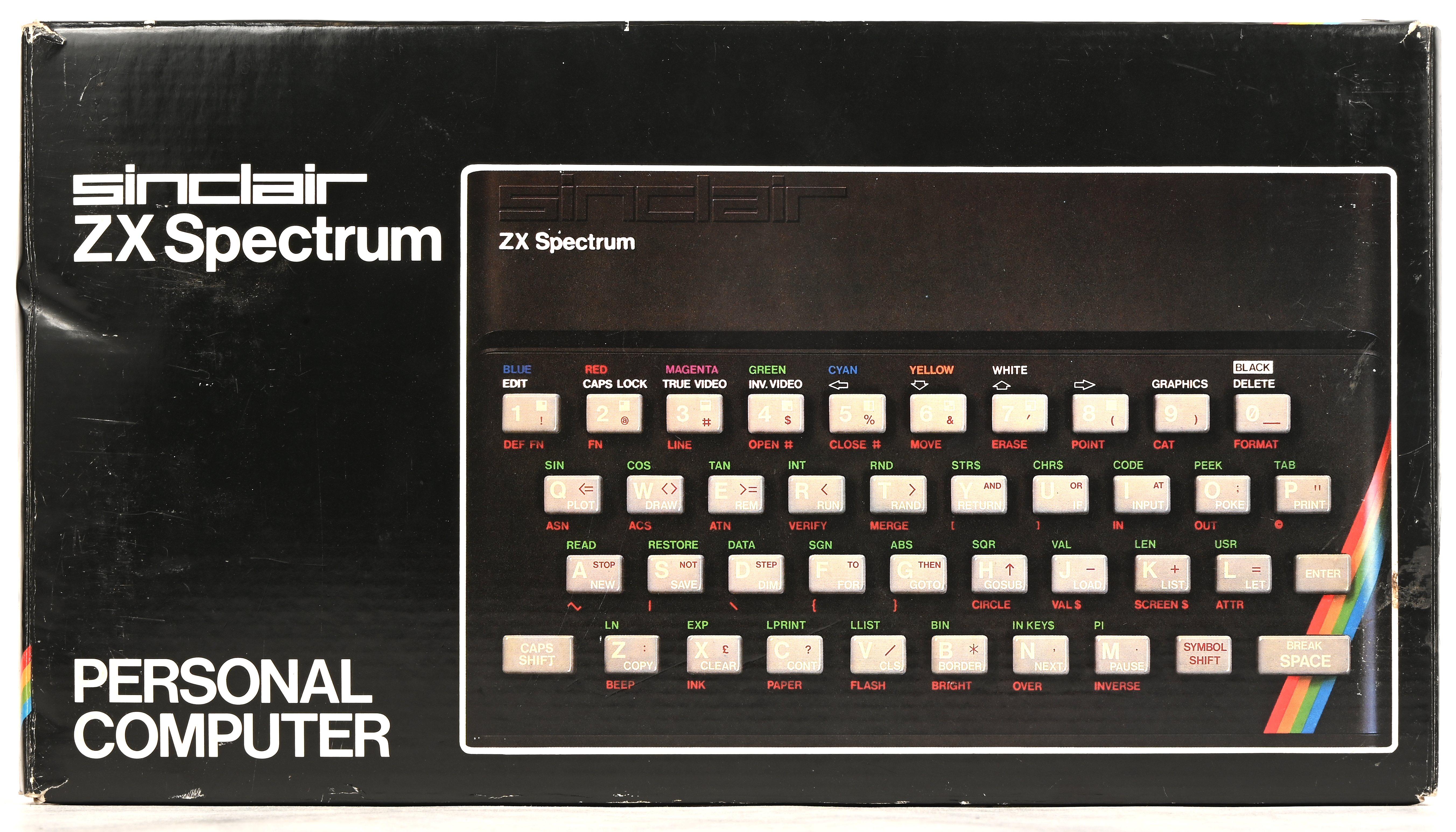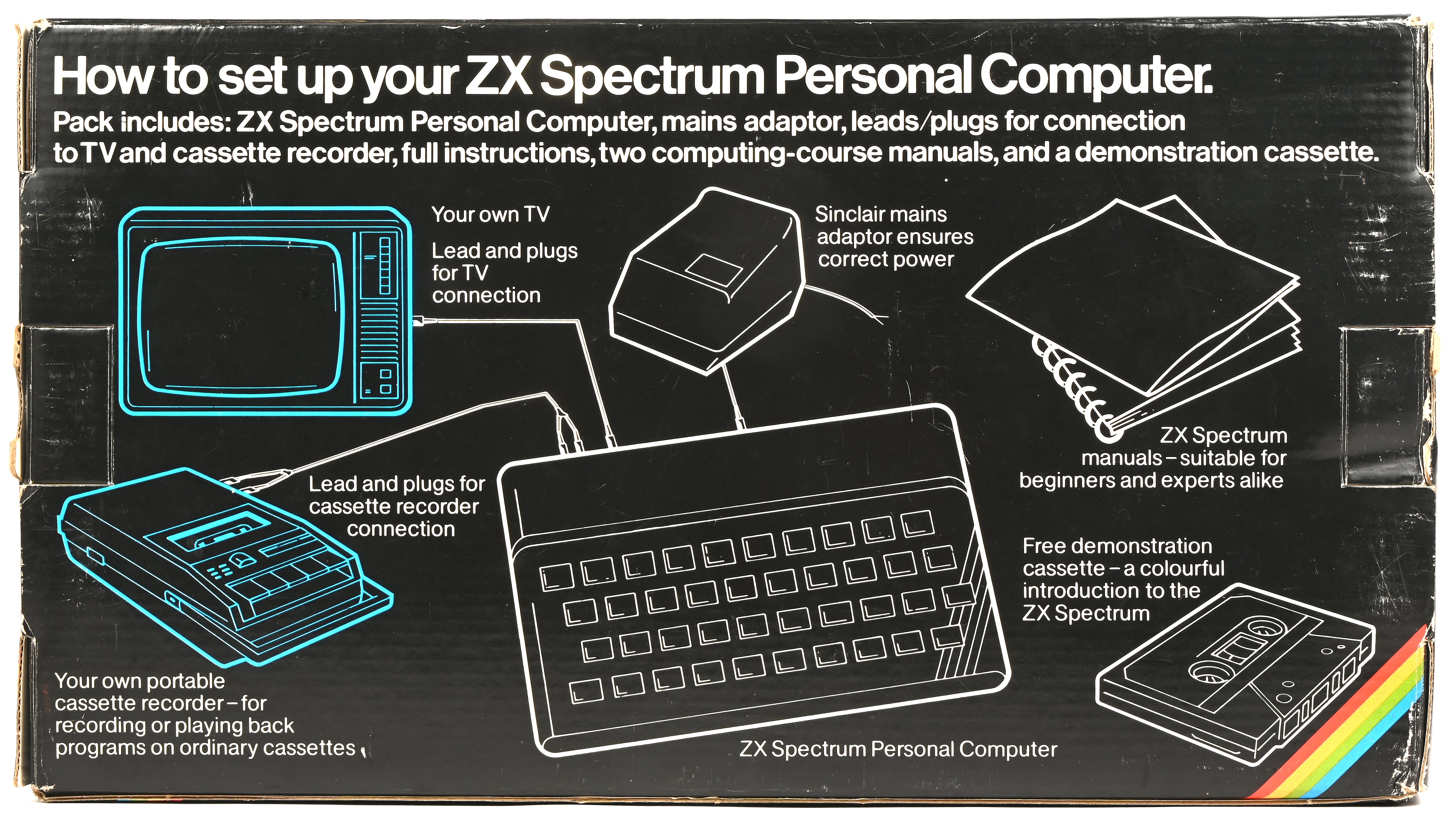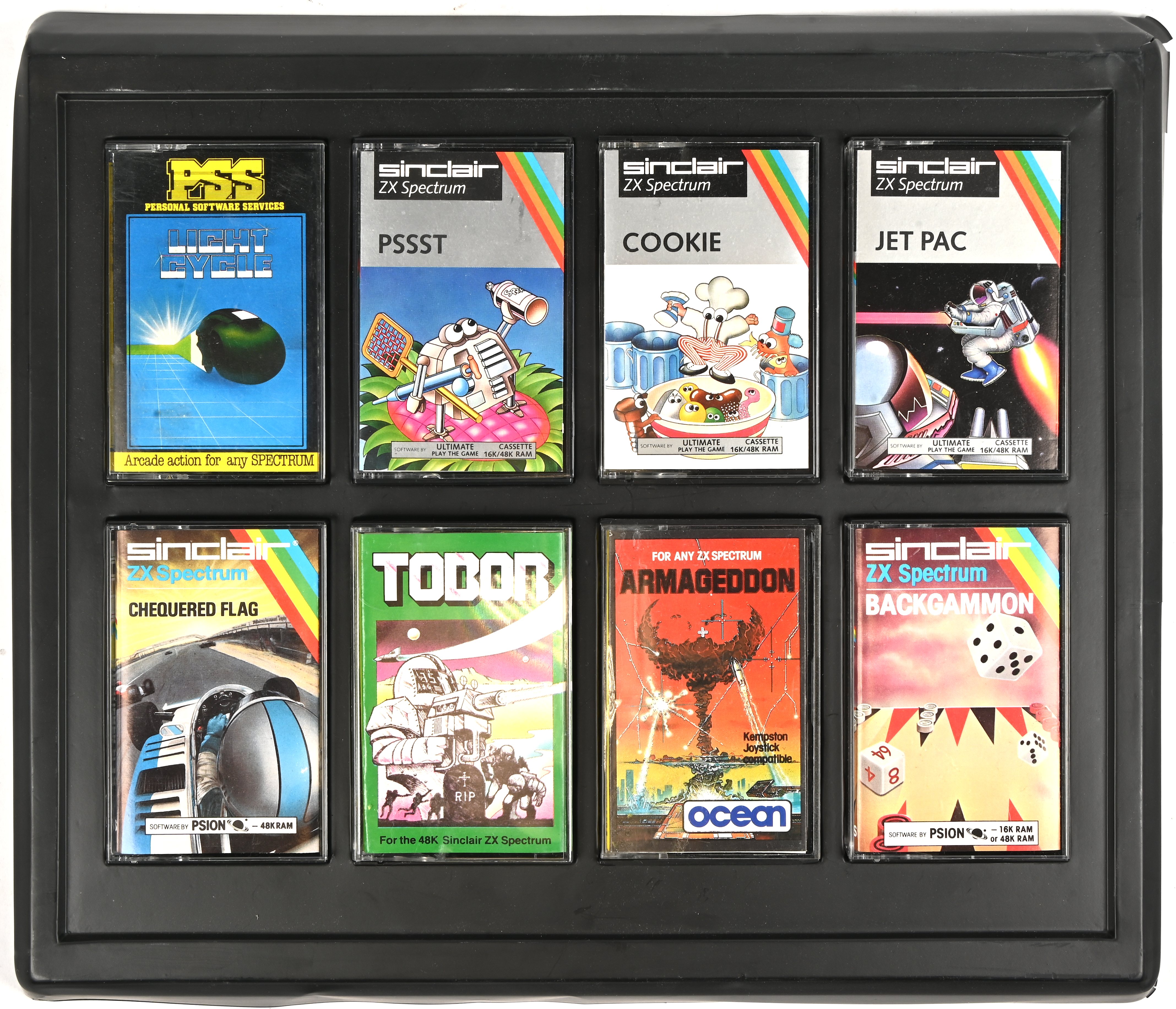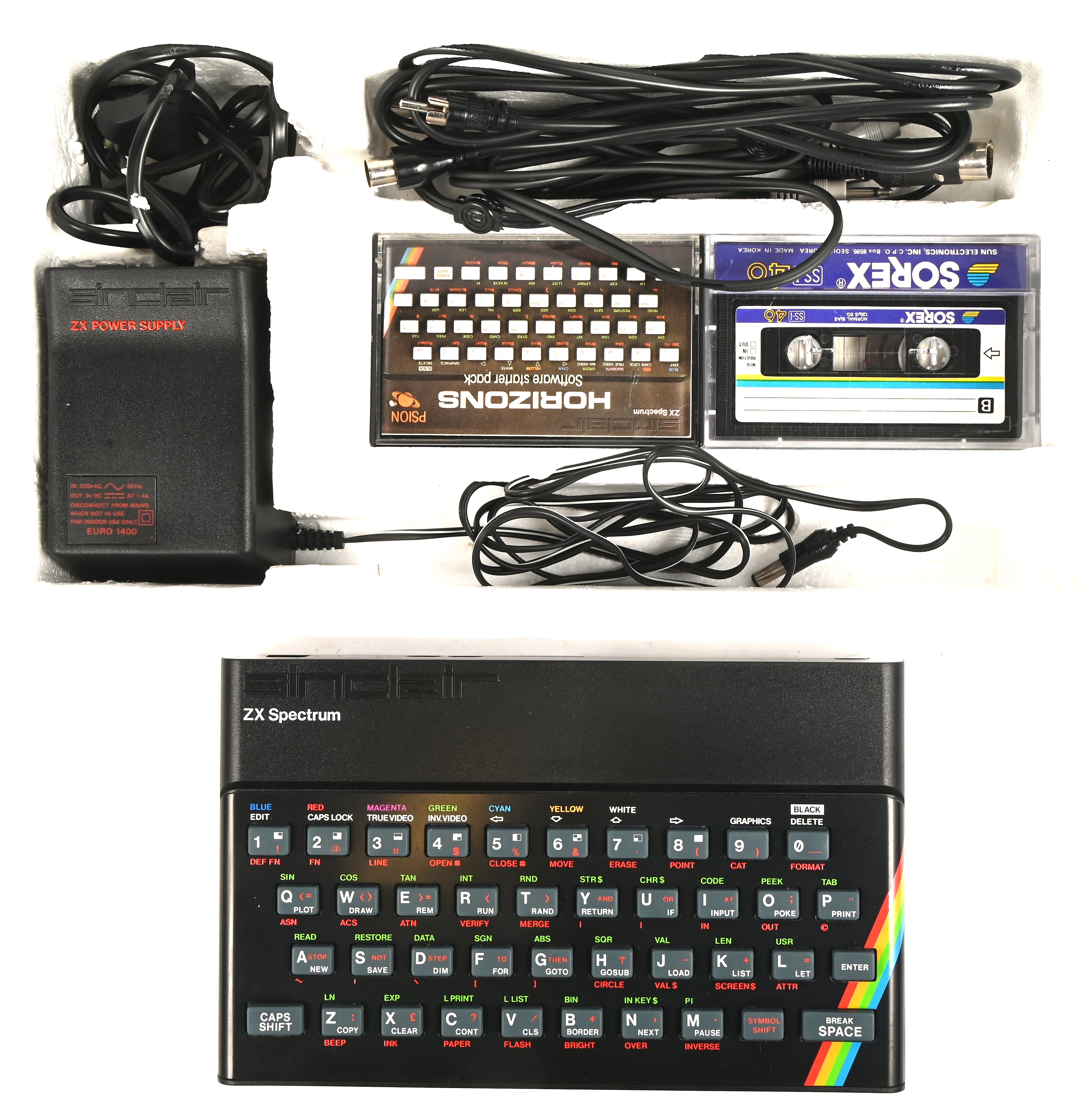 A Sinclair ZX Spectrum personal computer, 48k in original box and packaging, in new condition, with the accompanying set of 8 games on cassette (boxes of cassettes in lesser condition).
