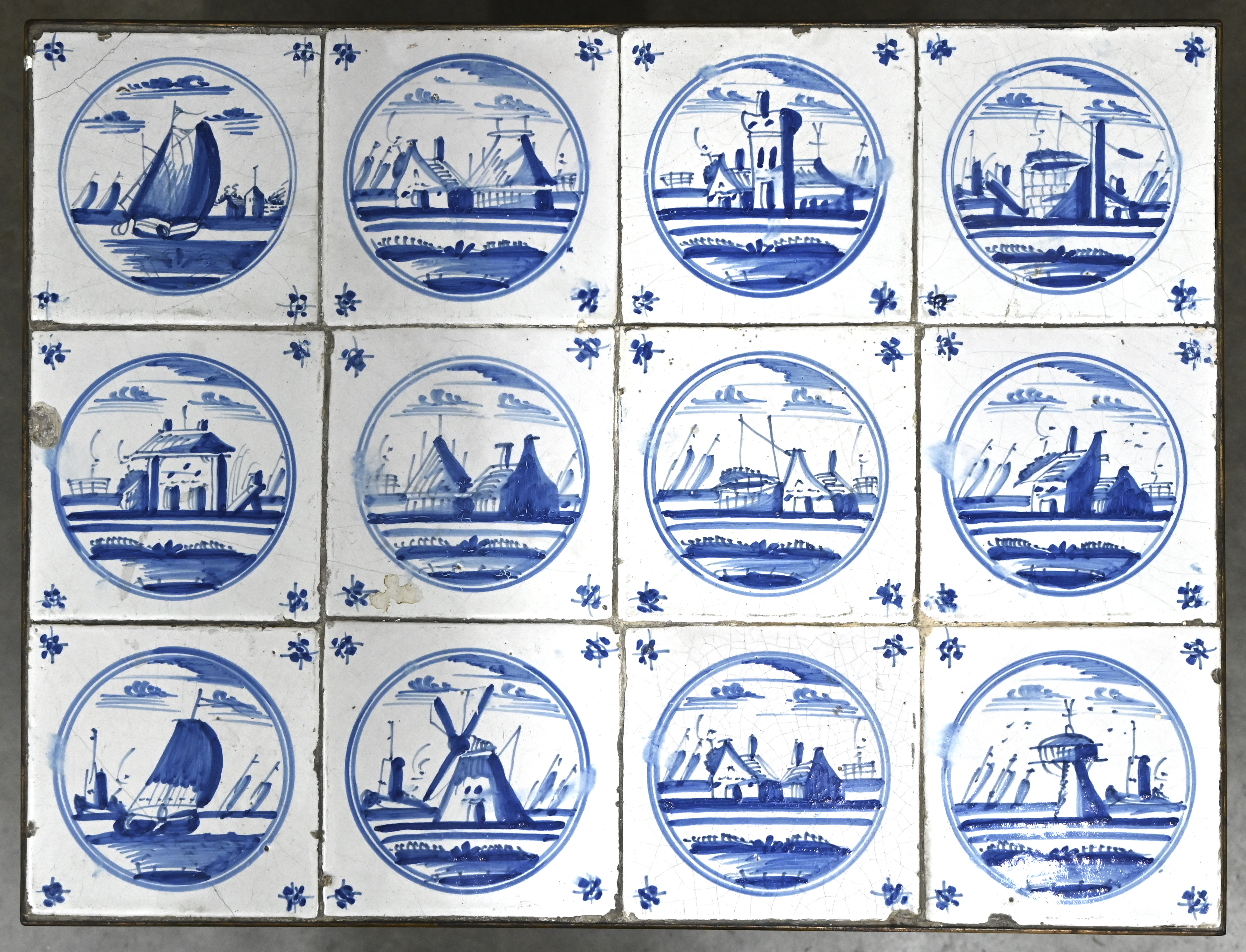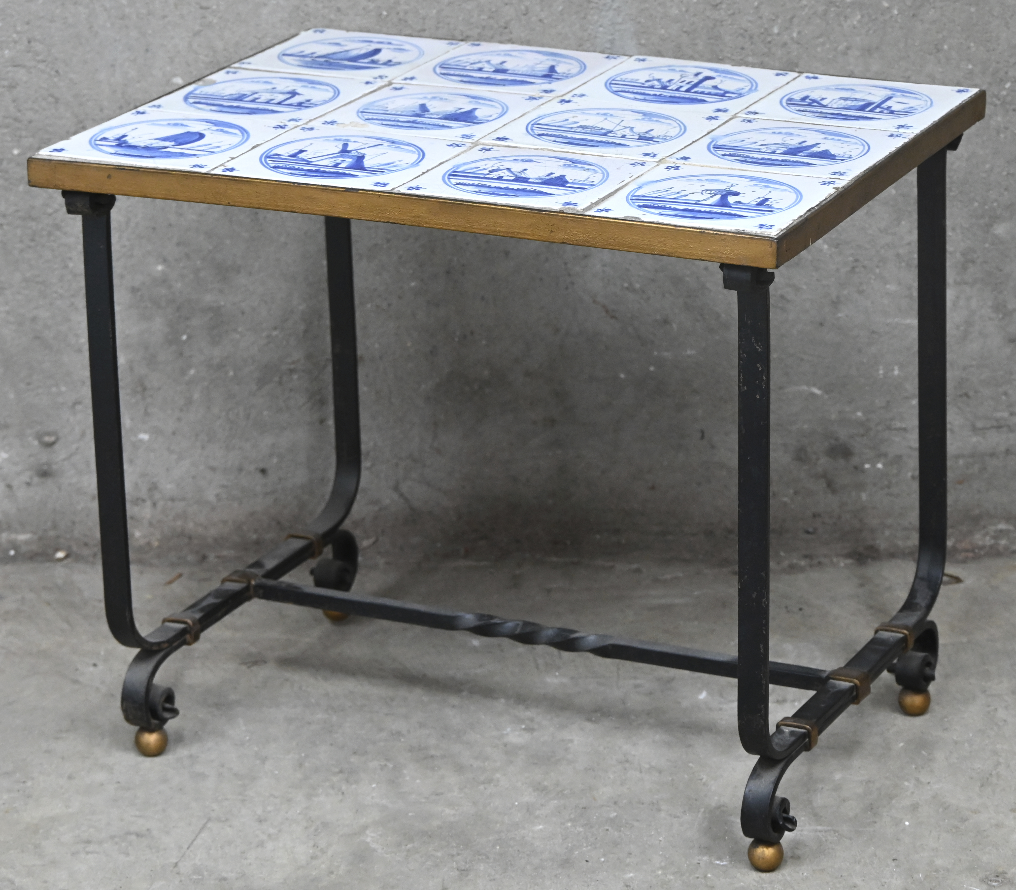 Een smeedijzeren bijzettafeltje met 12 oude Delftse tegels.