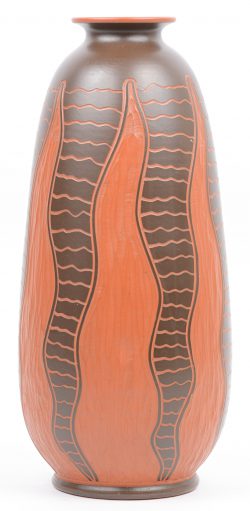 #88Een terracotta vaas met deels geglazuurd decor. Onderaan gemerkt. Jaren ‘50.