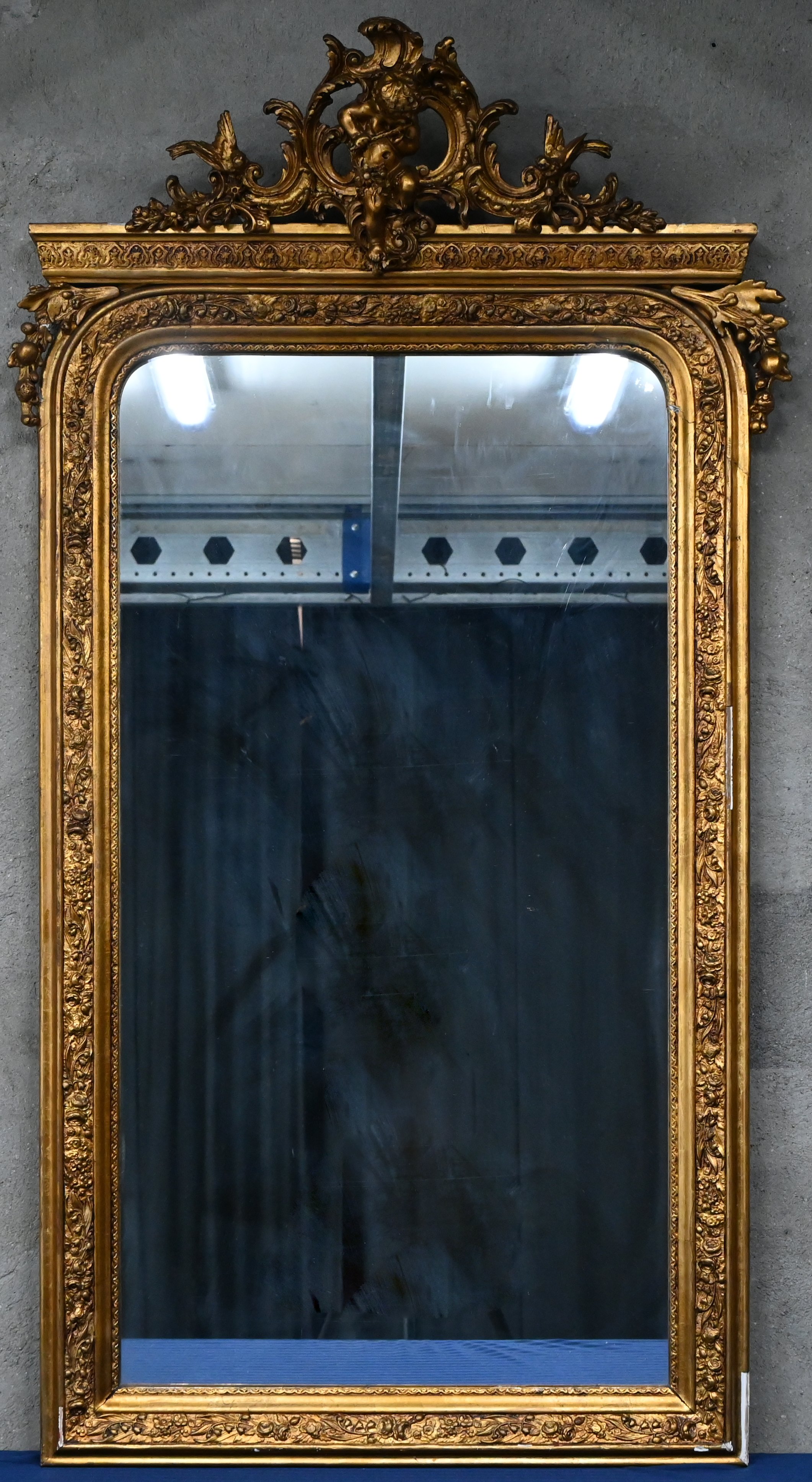 A mirror in gilded frame with crest. With damage/repairs.