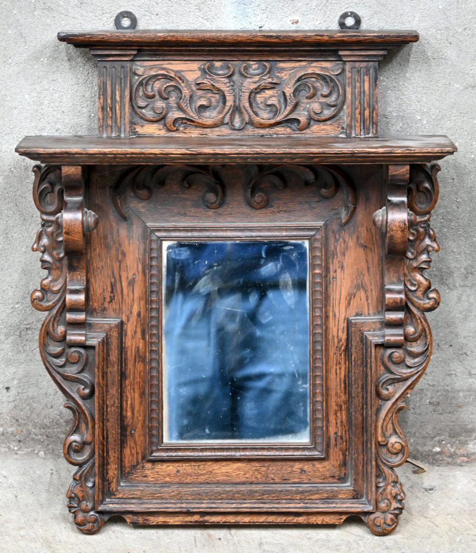 Een spiegel met gesculpteerd massief eikenhouten kader.