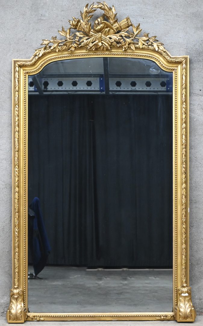 #109Een oude geslepen spiegel in vergulde kader met guirlandes en een romantische schildering op board. Schade aan de kader.