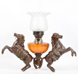 #448Een olielamp met oranje glazen recipiënt, gedragen door twee steigerende paarden van zamak.