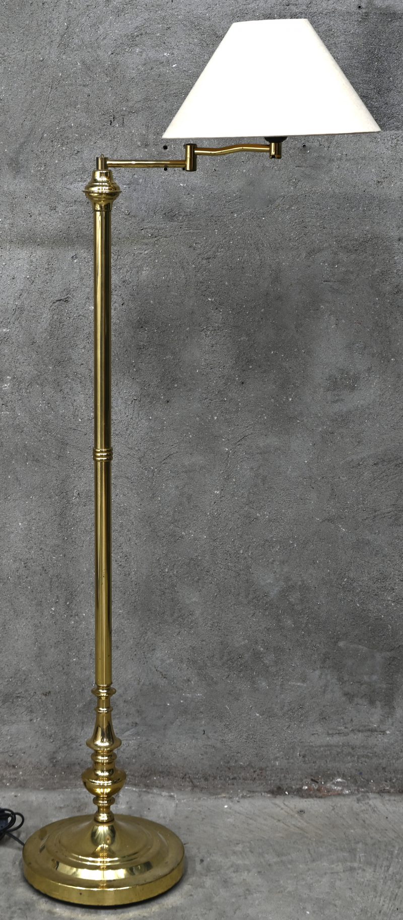 A floor lamp, brass base with ecru fabric shade.No longer availableOnline onlyActive bid: 45.00 €Dim. h 128 cm (met kap)Estimate: € 40 / 60 -