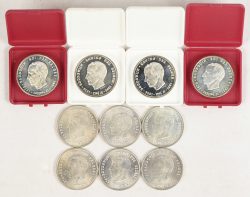 Ten coins of 250 BEF, 5 in Dutch and 5 in French, four in a case. Ag. 835/1000, 25 g. -