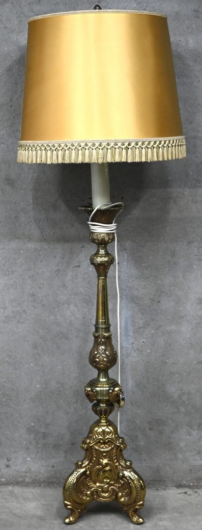 Een staande lamp met massieve messing voet, oa gedecoreerd met engeltjes.
