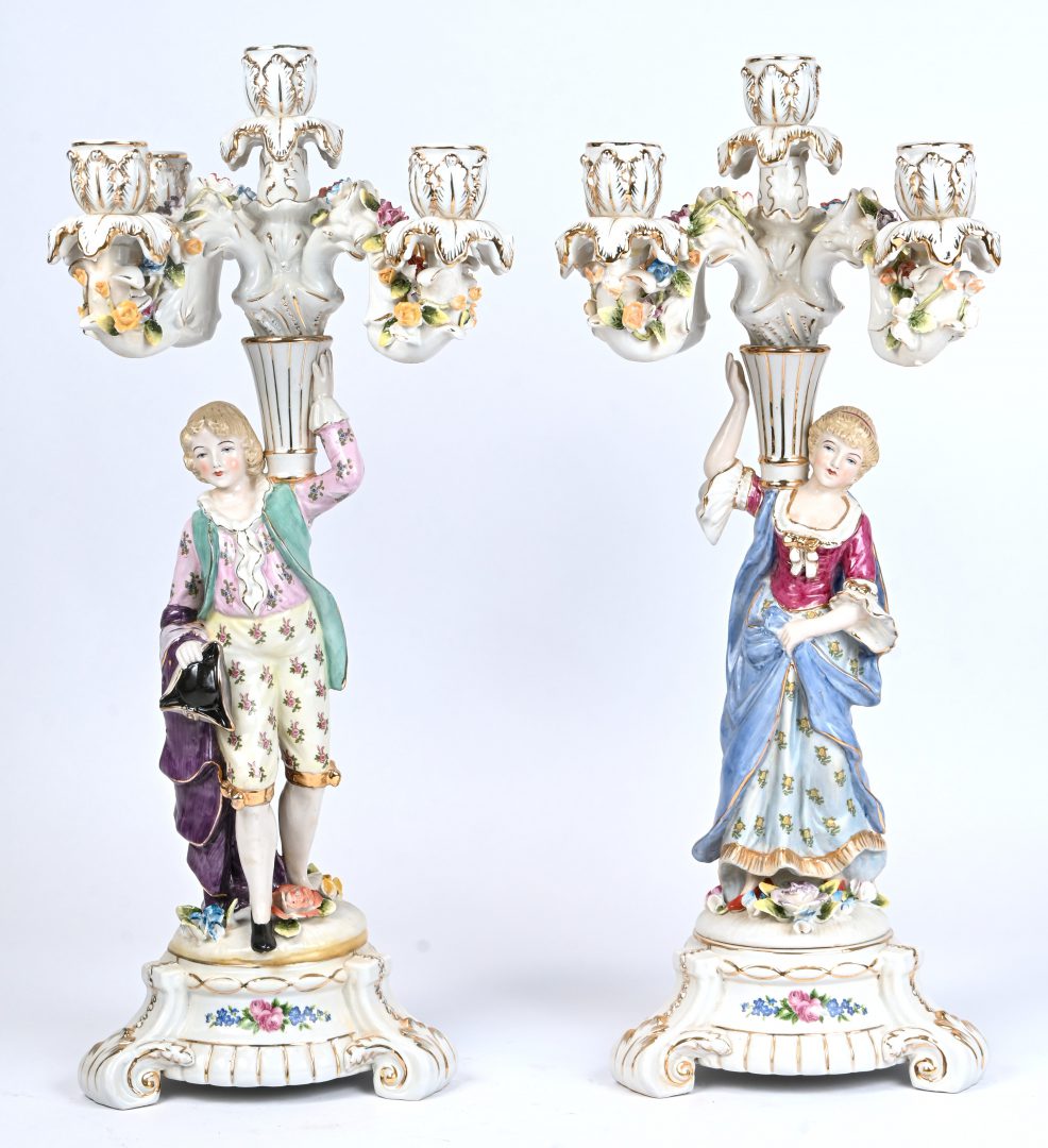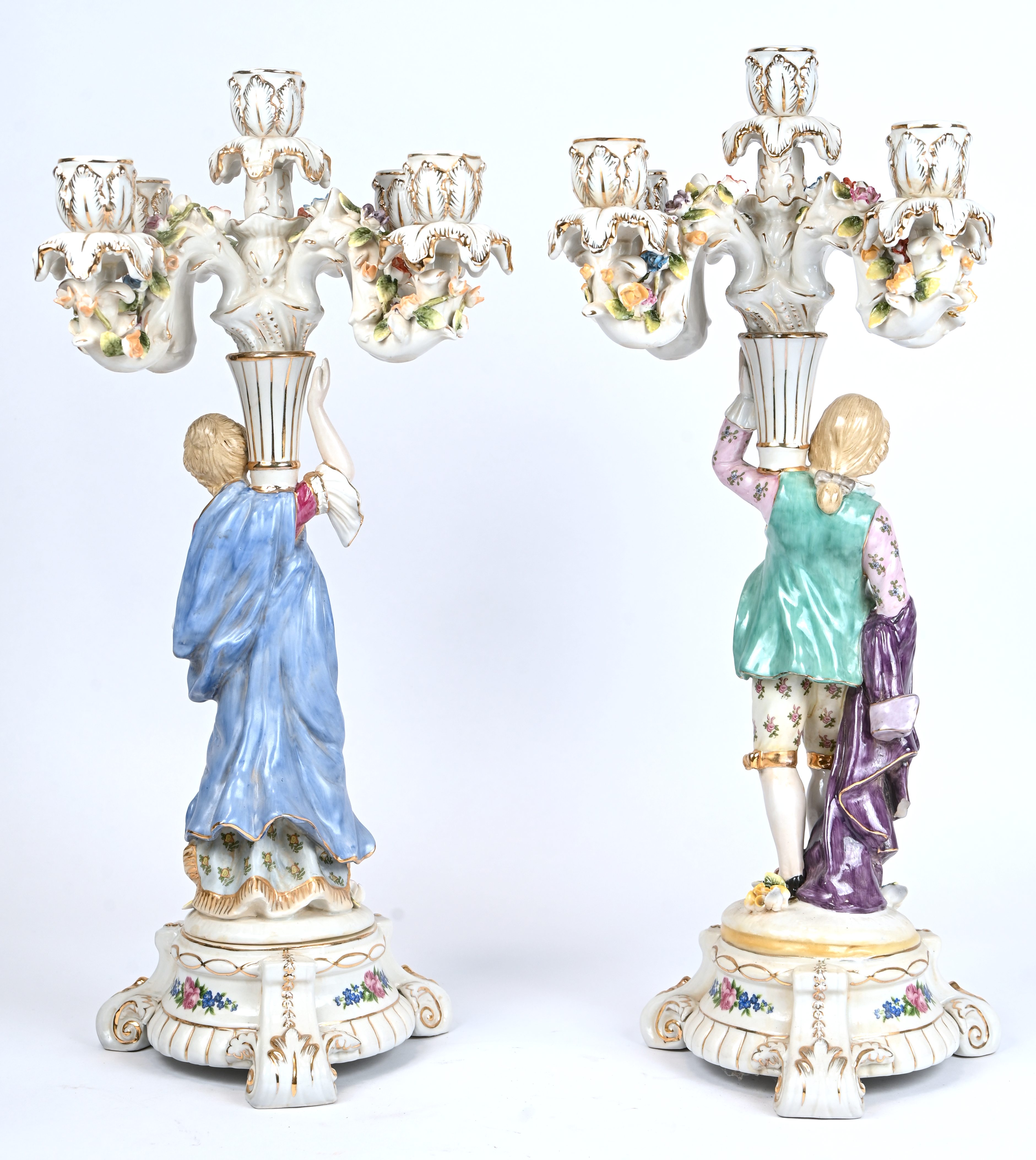 Een stel porseleinen kandelaars gedragen door een jonkheer en dame, gemerkt met gekruiste zwaarden boven een R.