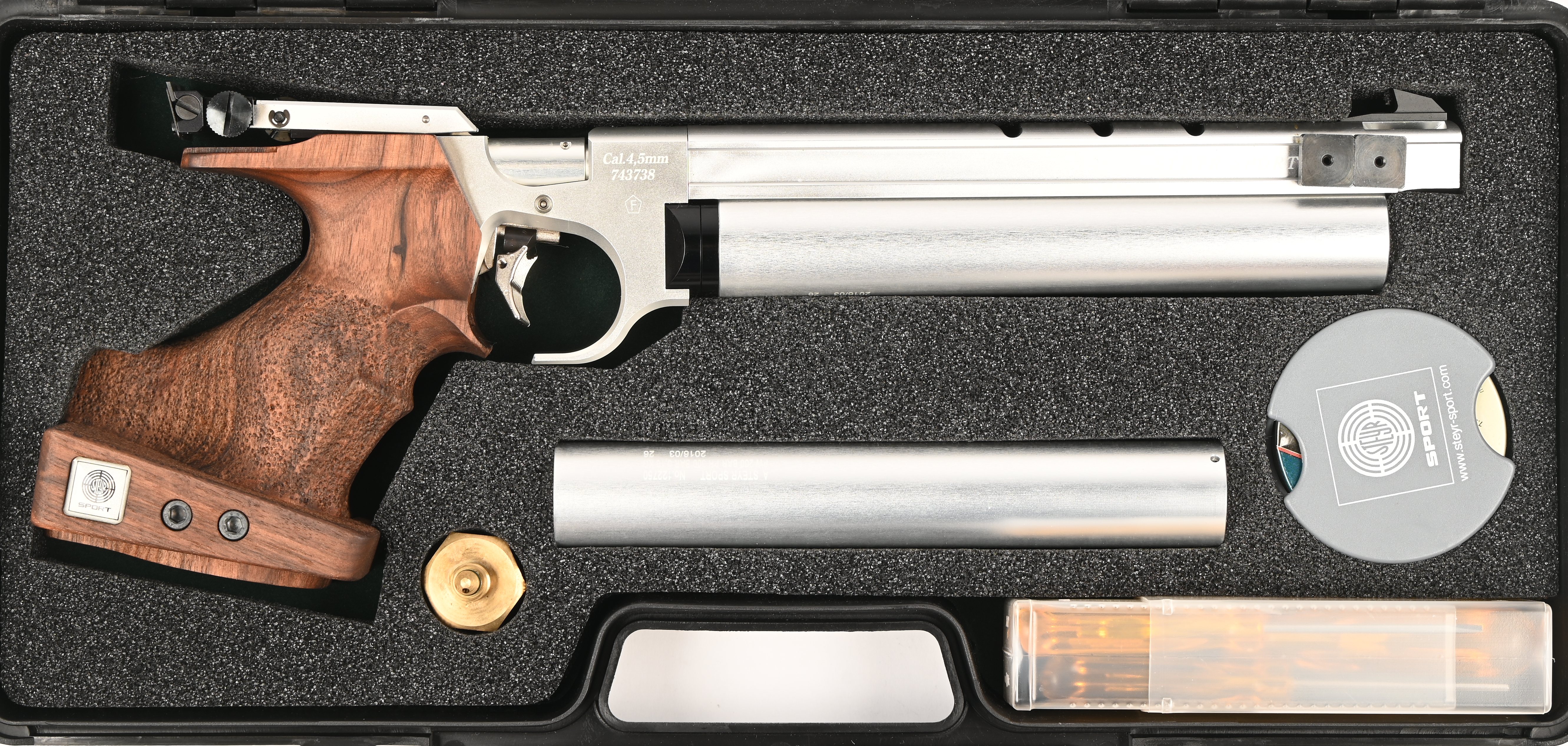 A Walther lg300xt air rifle in case. This rifle has an energy of 15.48 Joules, 4.5mm caliber, with a single-shot mechanism.No longer availableDim. 4.5 mmEstimate: € 400 / 600 -