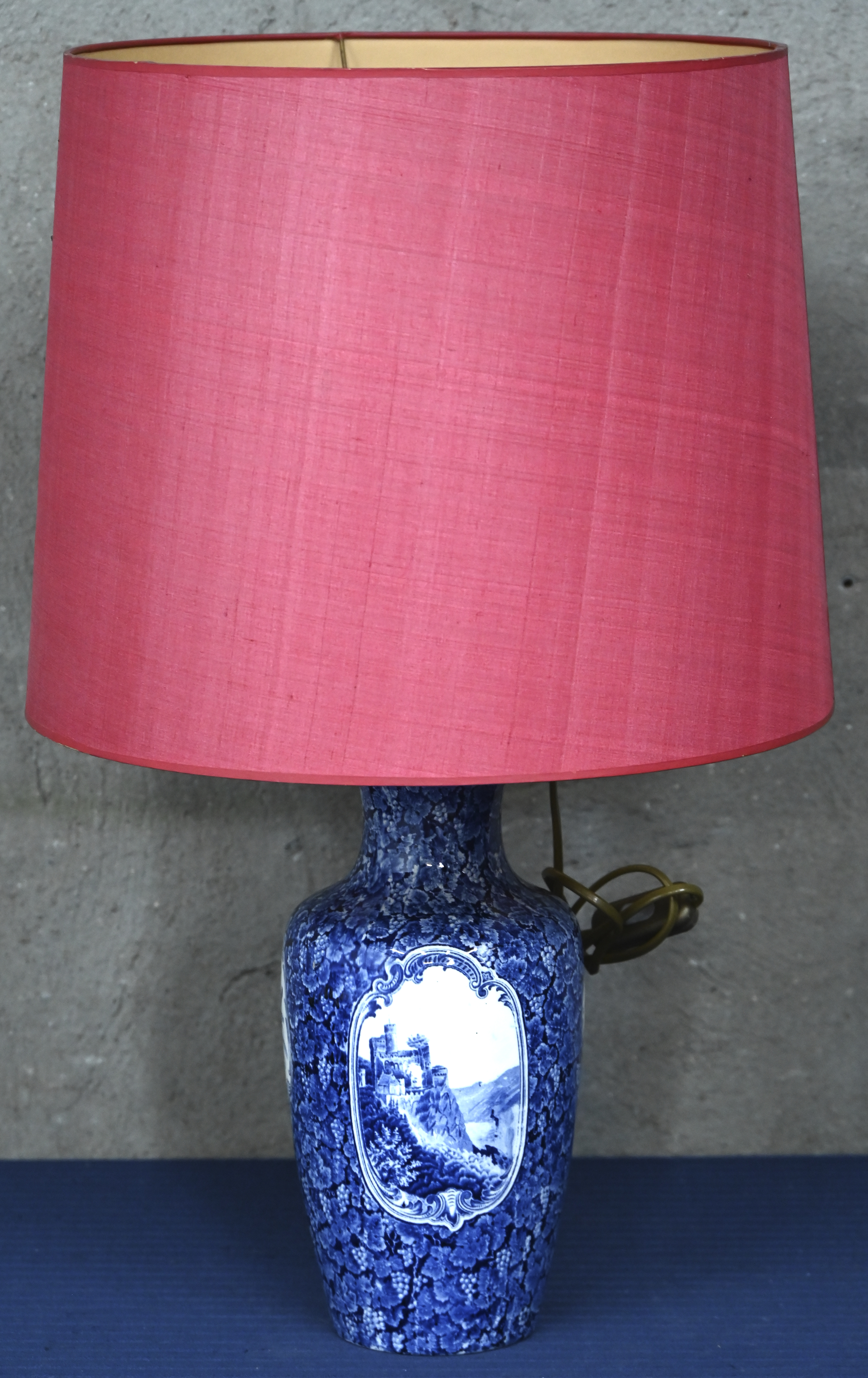 #150Een tafellamp met voet in Chinese stijl, décor a la main. Faina en flora op zalmroze achtergrond.