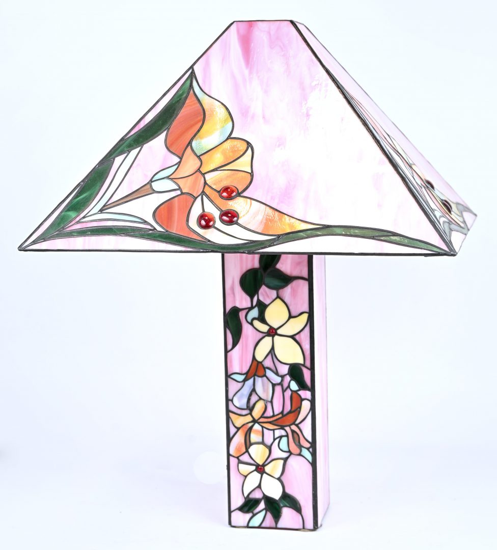 Een tafellamp met kap en voet van glas-in-lood, in de stijl van Tiffany. Met een decor van bloemen.