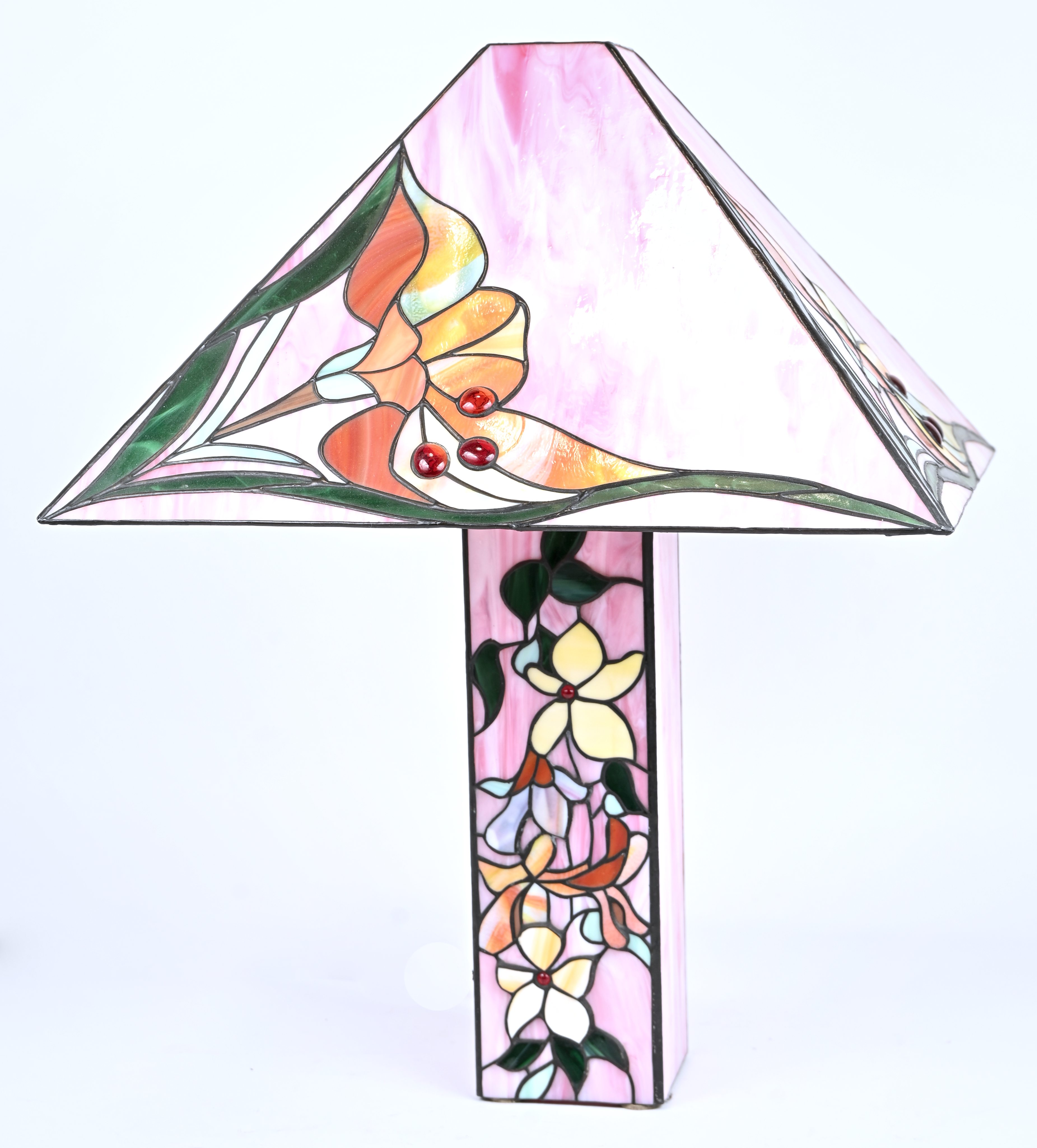 A table lamp with stained glass shade and base, in the Tiffany style. Decorated with flowers.