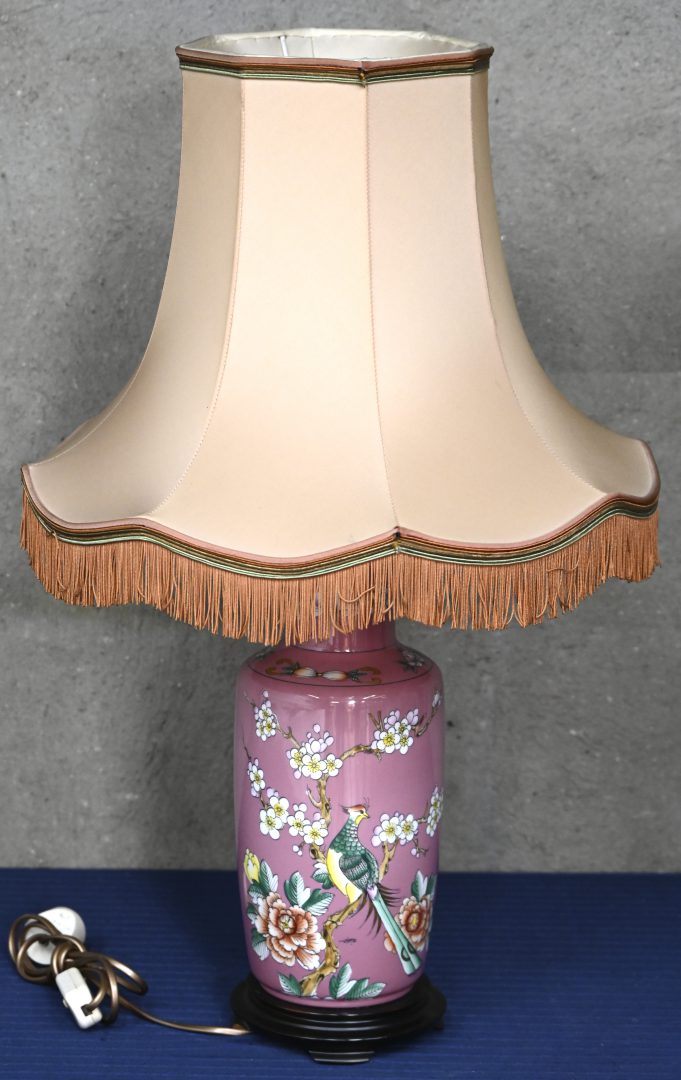A table lamp with a porcelain Rhine vase base and a wine red shade. -