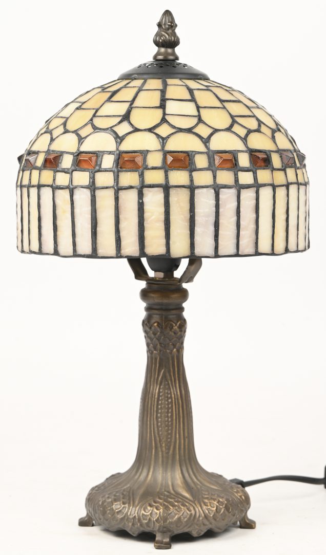 A table lamp in Tiffany style, one glass piece damaged. -