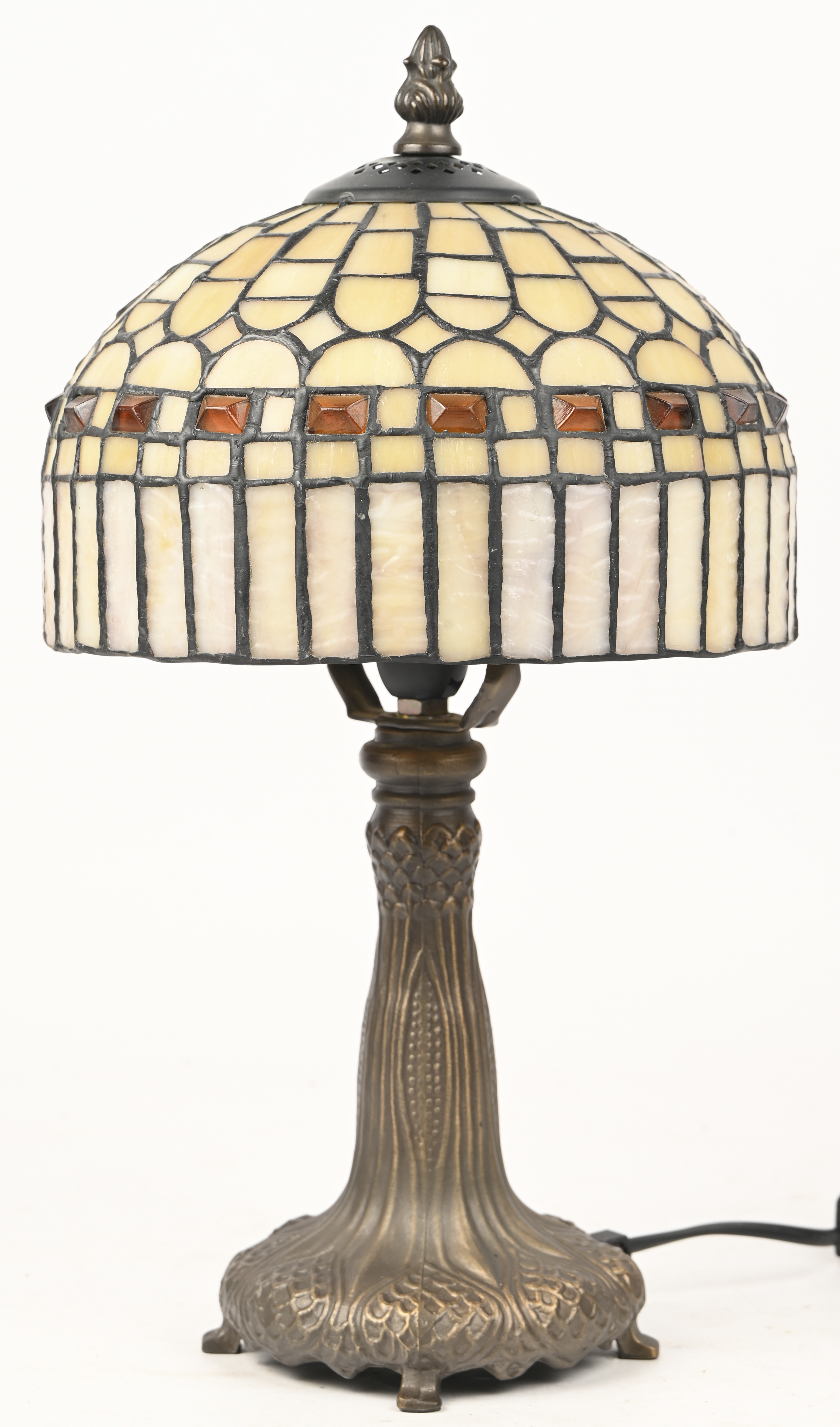 #91Een tafellamp in Tiffany stijl, één glazen deeltje beschadigd.