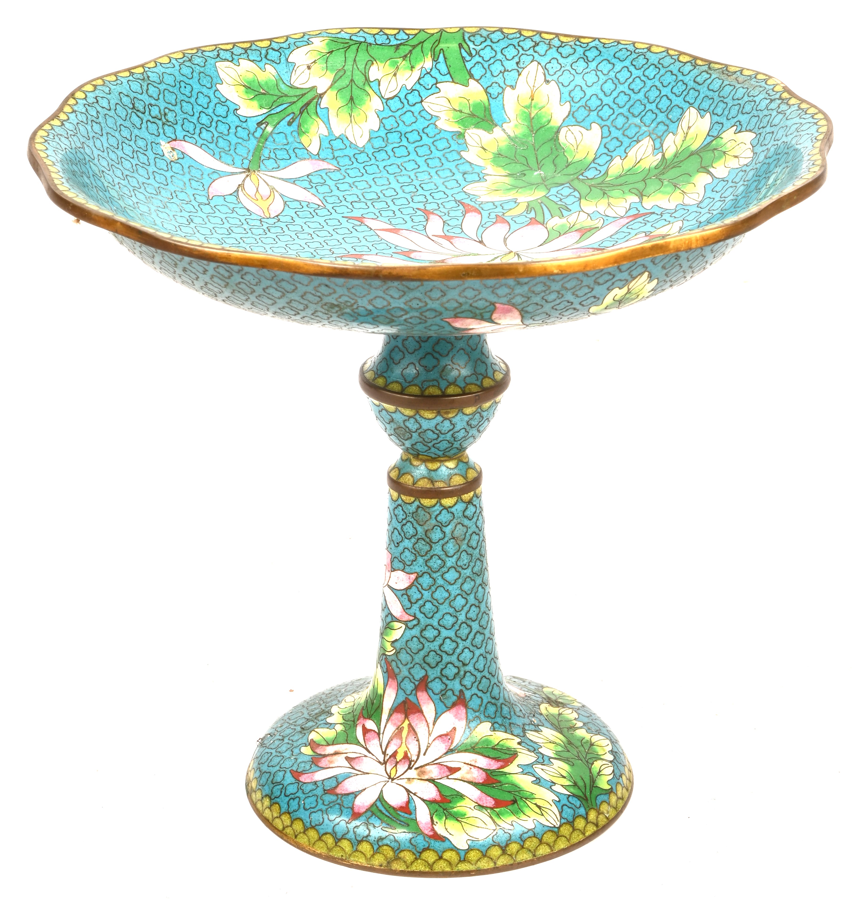 A cloisonné on brass tazza. Multicolored floral decor of peonies on a light blue field. Chinese work, early 20th century.