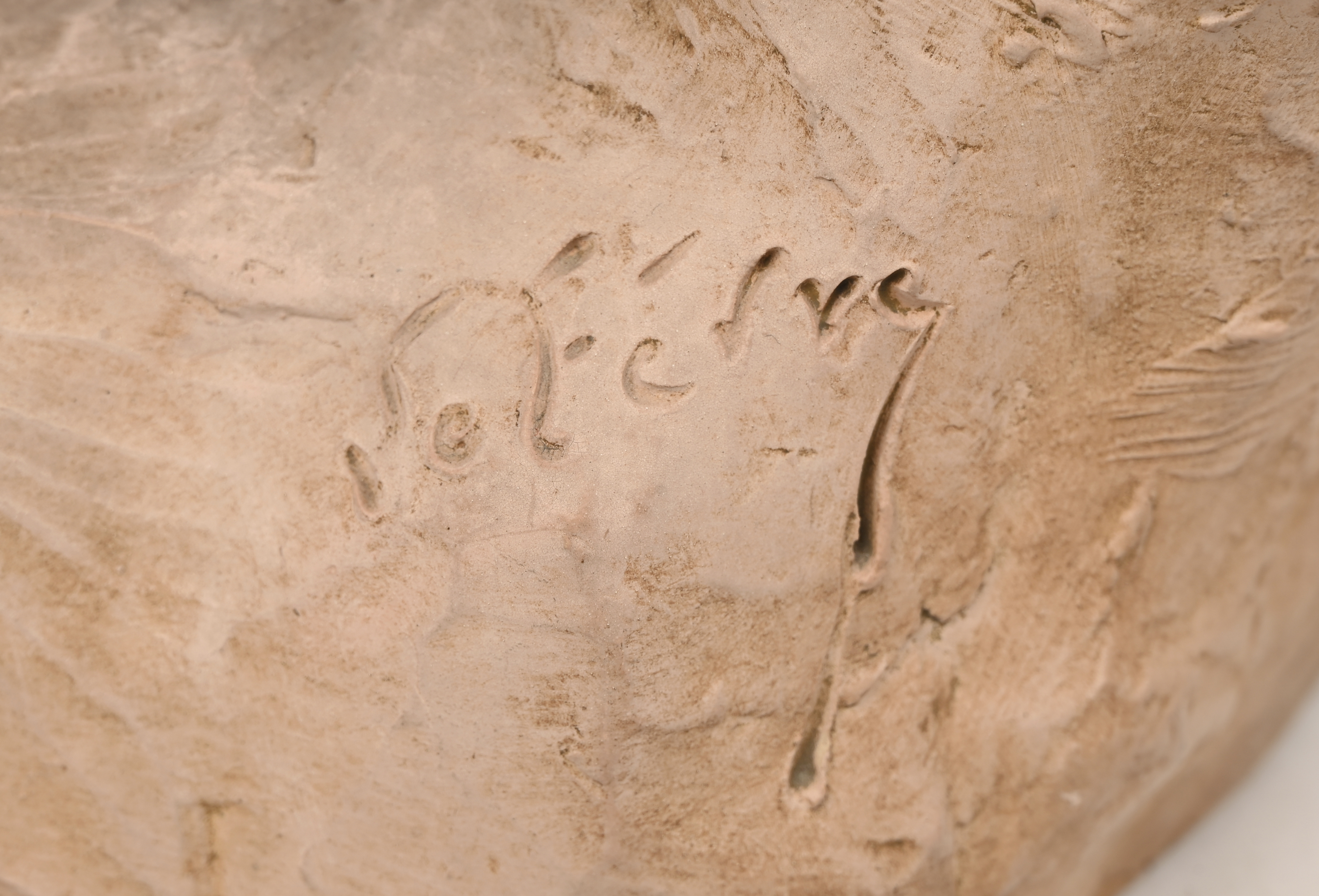 #170“La Piéta”, een 19e eeuws aardewerken beeld op sokkel, opschrift achteraan F. Gilkens 1885 Hasselt.
