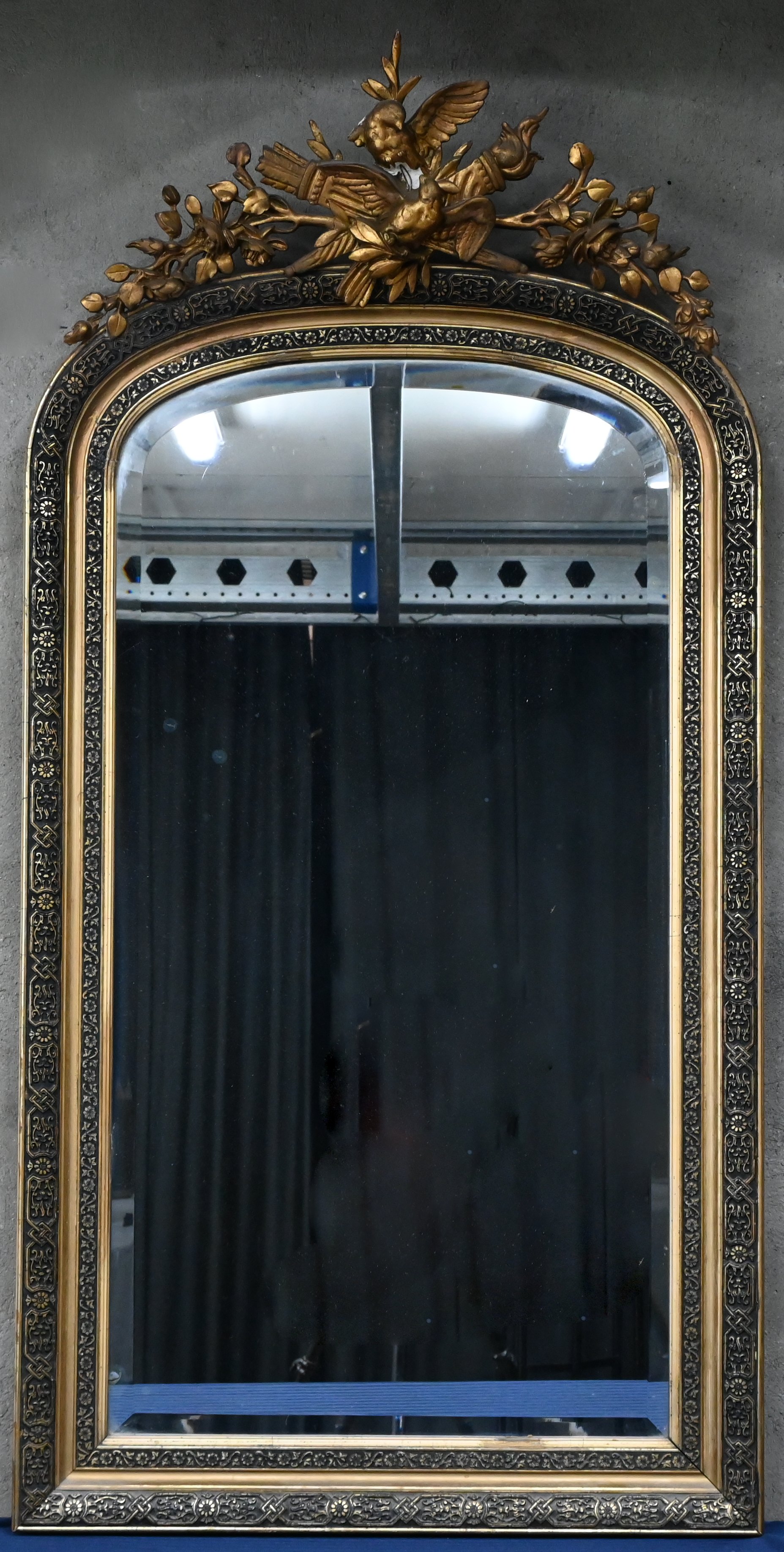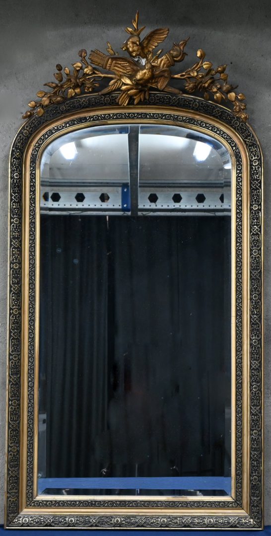 A trumeau mirror in Empire style, decorated with plaster birds and flowers at the top (damage).