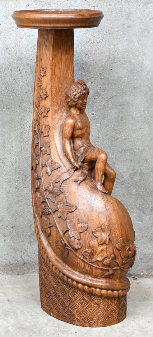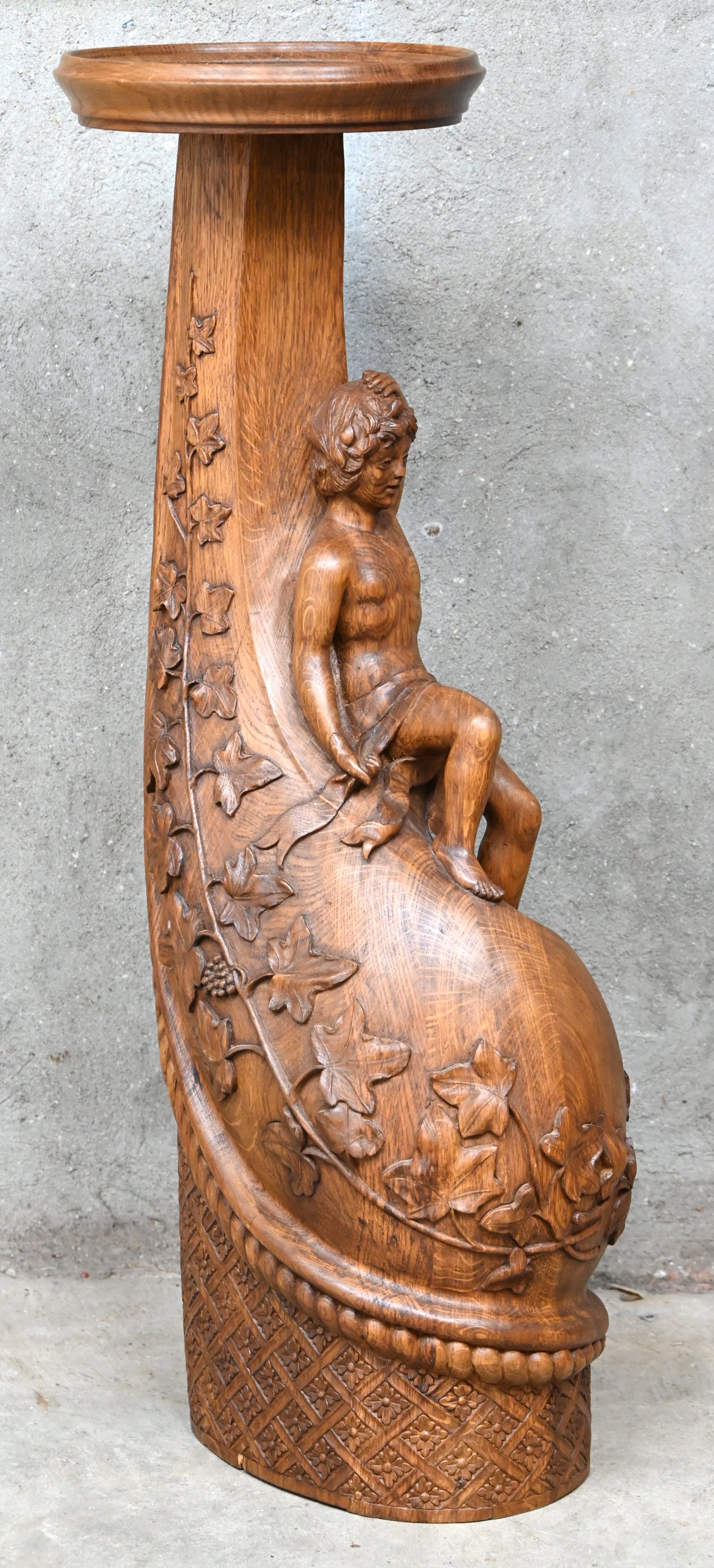 A solid oak sculpted pied de stal with a resting man, artist unknown.