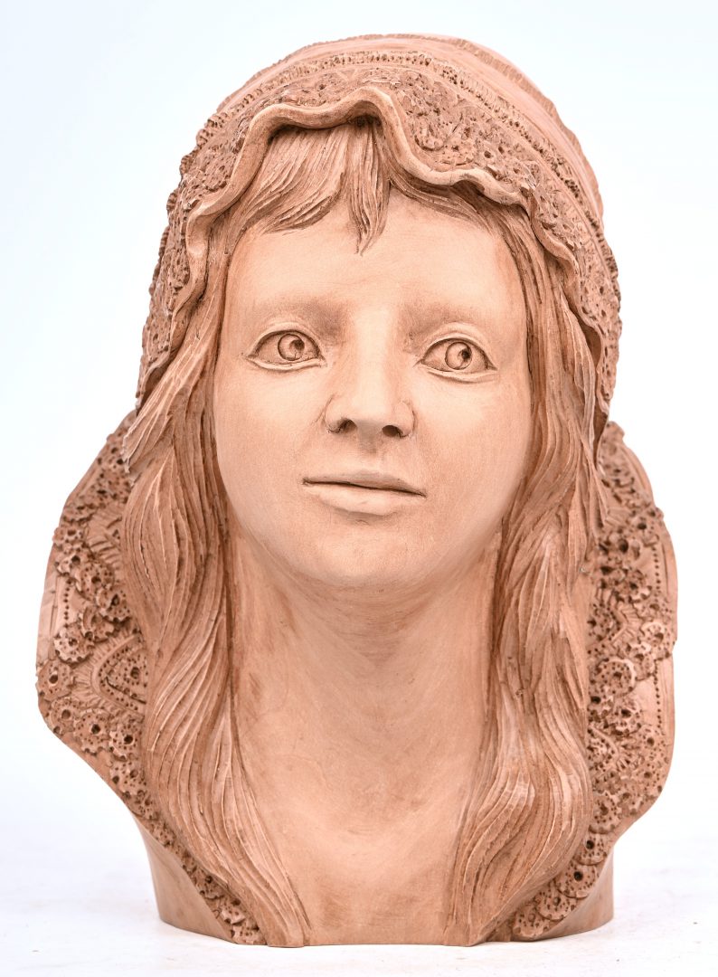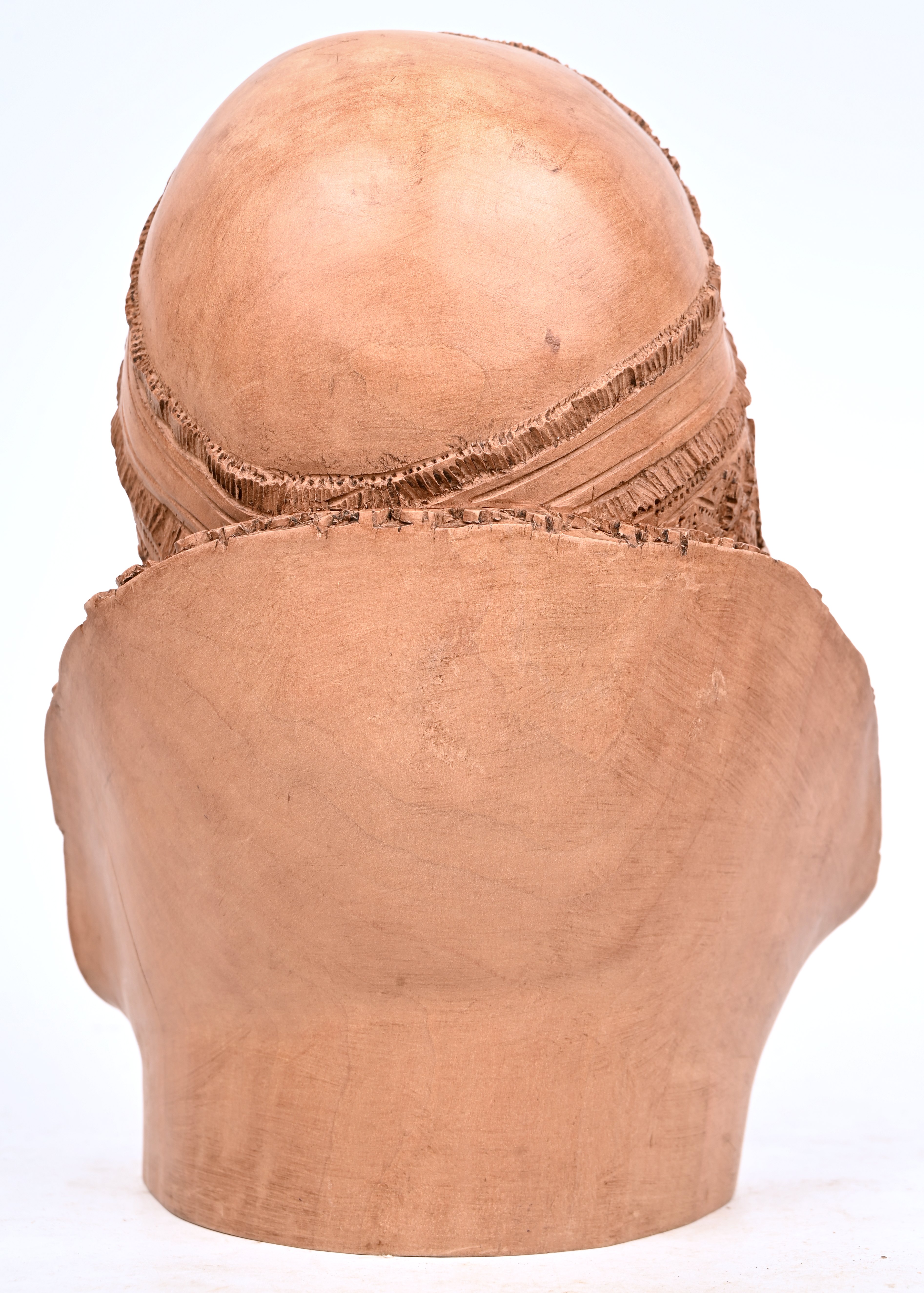 Een uit massief hout gesculpteerd meisjeshoofd, kunstenaar onbekend.