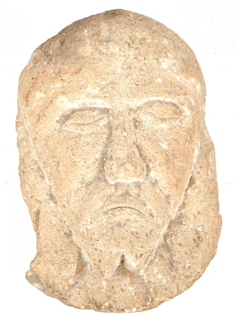 Een uit steen gesculpteerd gelaat uit “Nieuw Spanje”.