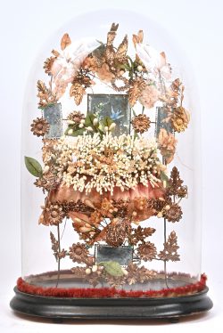 #41Een oude decoratieve stolp met een rijkelijk versierd stoeltje. Van metaal en beschilderde spiegeltjes gedecoreerd met bloemen en een goudkleurige spreeuw.