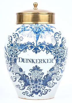 A tobacco jar of blue and white glazed Delft earthenware with a copper lid. Marked L P Kan (Lampetkan). -