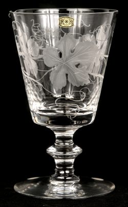 A large chalice of colorless crystal with an engraved decoration of grape leaves. Signed and marked with a sticker. -